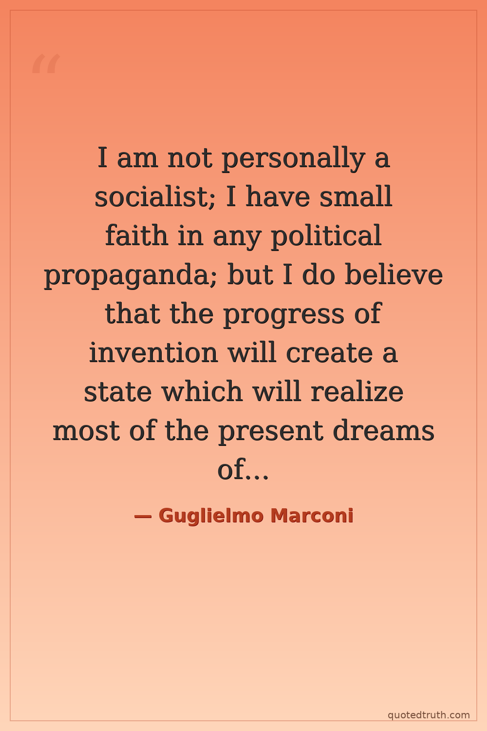 I am not personally a socialist; I have small faith in any political propaganda; but I do believe that the progress of invention will create a state which will realize most of the present dreams of the socialists.