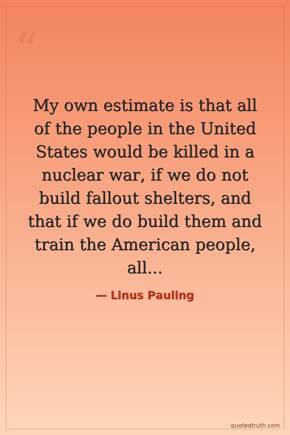 My own estimate is that all of the people in the United States would be killed in a nuclear war, if we do not build fallout shelters, and that if we do build them and train the American people, all of the American people would be killed in a nuclear war.