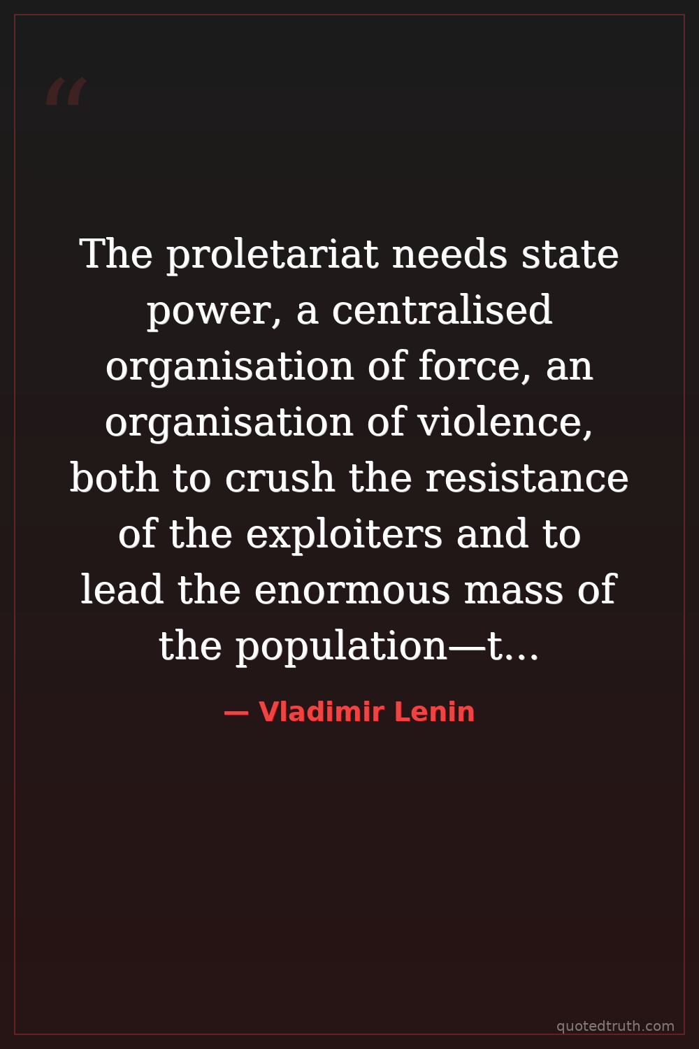 The proletariat needs state power, a centralised organisation of force, an organisation of violence, both to crush the resistance of the exploiters and to lead the enormous mass of the population—the peasants, the petty bourgeoisie, and semi-proletarians—in the work of organising a socialist economy.