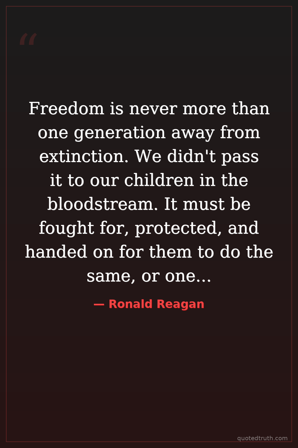 Freedom is never more than one generation away from extinction. We didn't pass it to our children in the bloodstream. It must be fought for, protected, and handed on for them to do the same, or one day we will spend our sunset years telling our children and our children's children what it was once like in the United States where men were free.