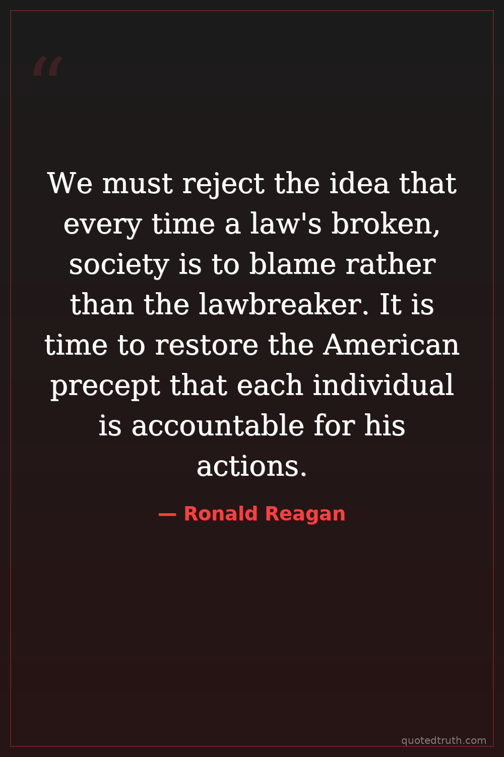 We must reject the idea that every time a law's broken, society is to blame rather than the lawbreaker. It is time to restore the American precept that each individual is accountable for his actions.