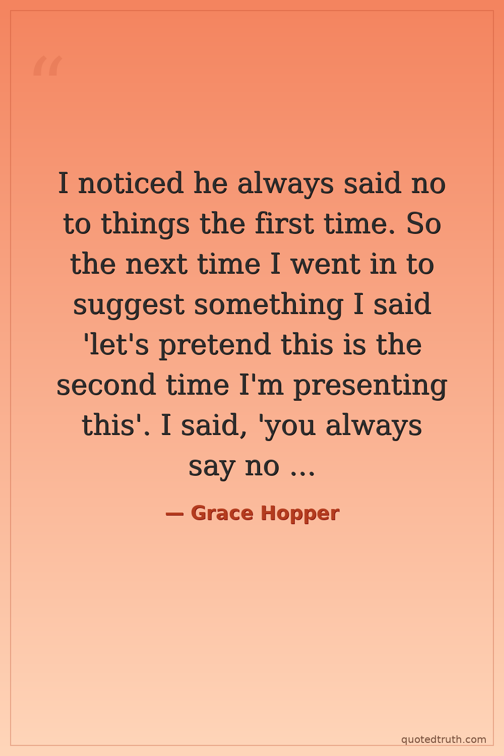 I noticed he always said no to things the first time. So the next time I went in to suggest something I said 'let's pretend this is the second time I'm presenting this'. I said, 'you always say no the first time'. And he looked at me with the funniest expression. I had him over the barrel from then on because I'd just go and say, 'this is the fourth time I'm requesting this, let's just say yes now'.