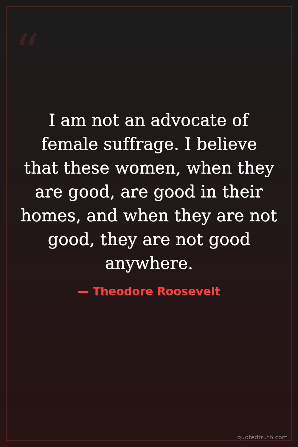 I am not an advocate of female suffrage. I believe that these women, when they are good, are good in their homes, and when they are not good, they are not good anywhere.