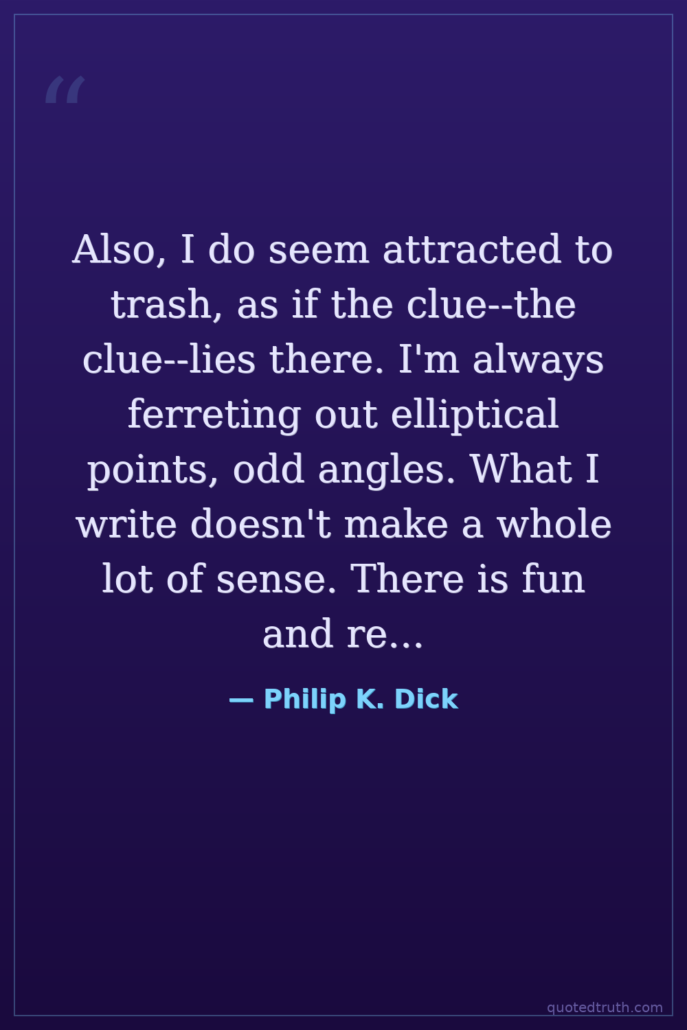 Also, I do seem attracted to trash, as if the clue--the clue--lies there. I'm always ferreting out elliptical points, odd angles. What I write doesn't make a whole lot of sense. There is fun and religion and psychotic horror strewn about like a bunch of hats.