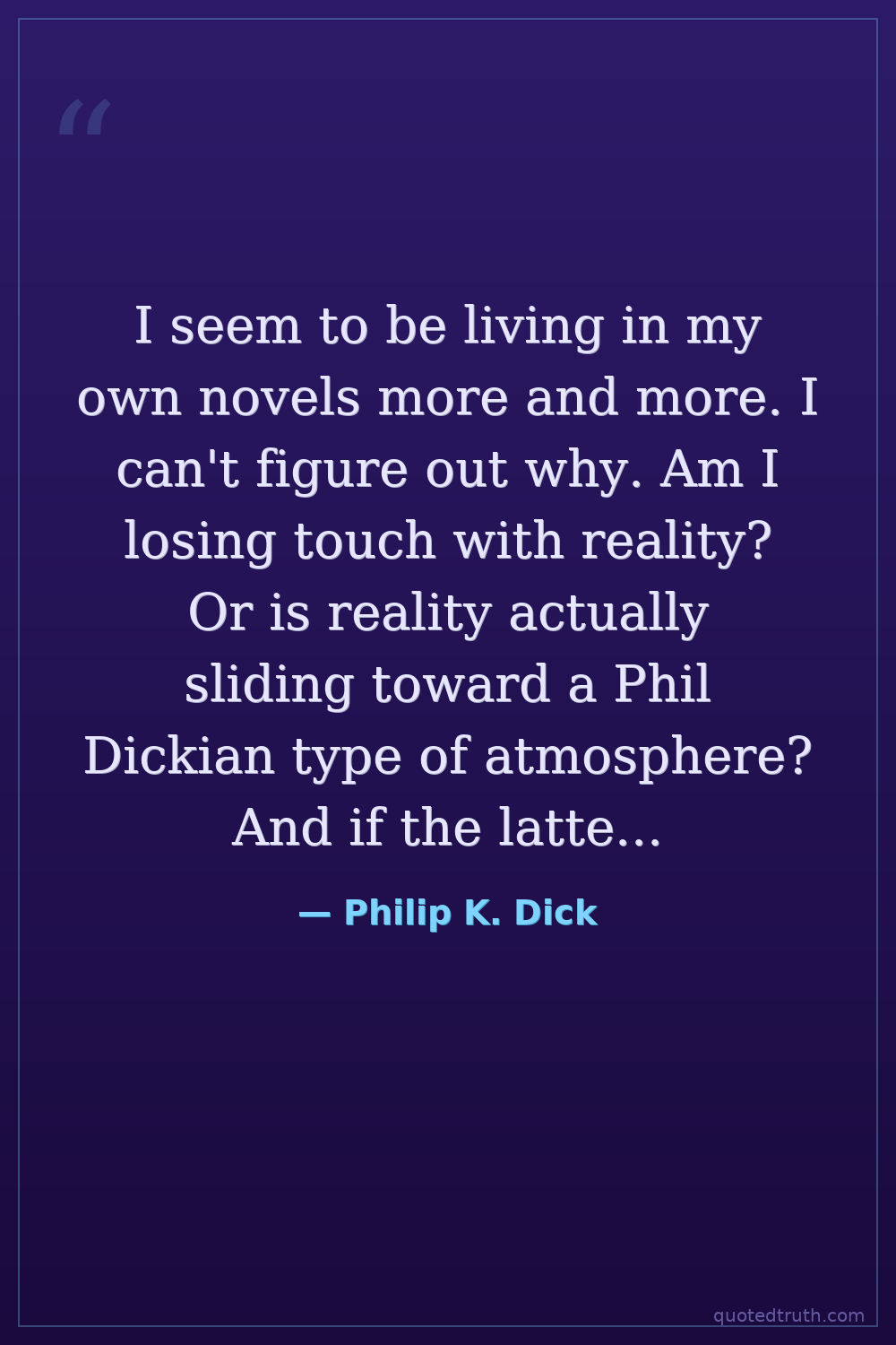 I seem to be living in my own novels more and more. I can't figure out why. Am I losing touch with reality? Or is reality actually sliding toward a Phil Dickian type of atmosphere? And if the latter, then for god's sake why? Am I responsible? How could I be responsible?