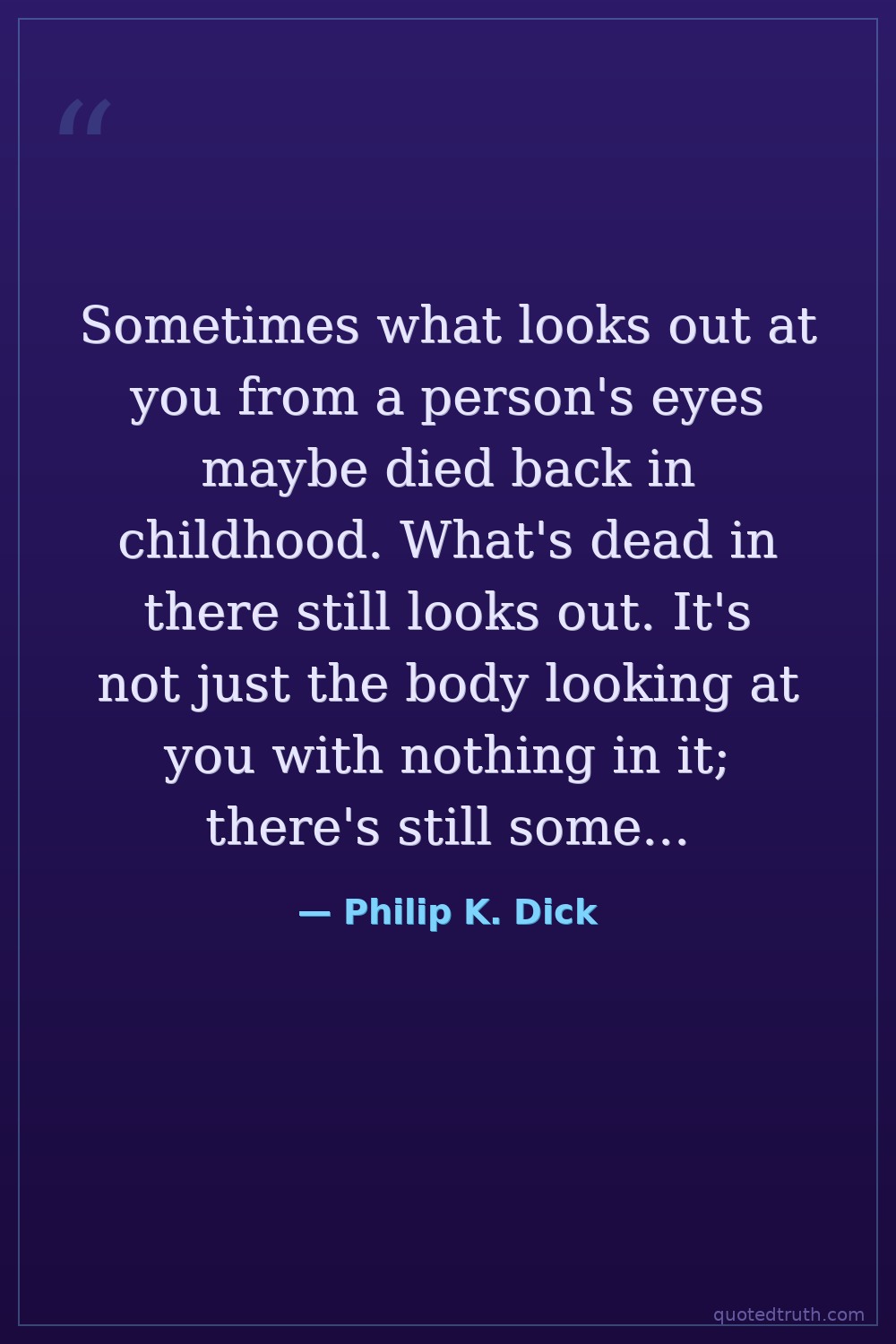 Sometimes what looks out at you from a person's eyes maybe died back in childhood. What's dead in there still looks out. It's not just the body looking at you with nothing in it; there's still something in there but it died and just keeps on looking and looking; it can't stop looking.