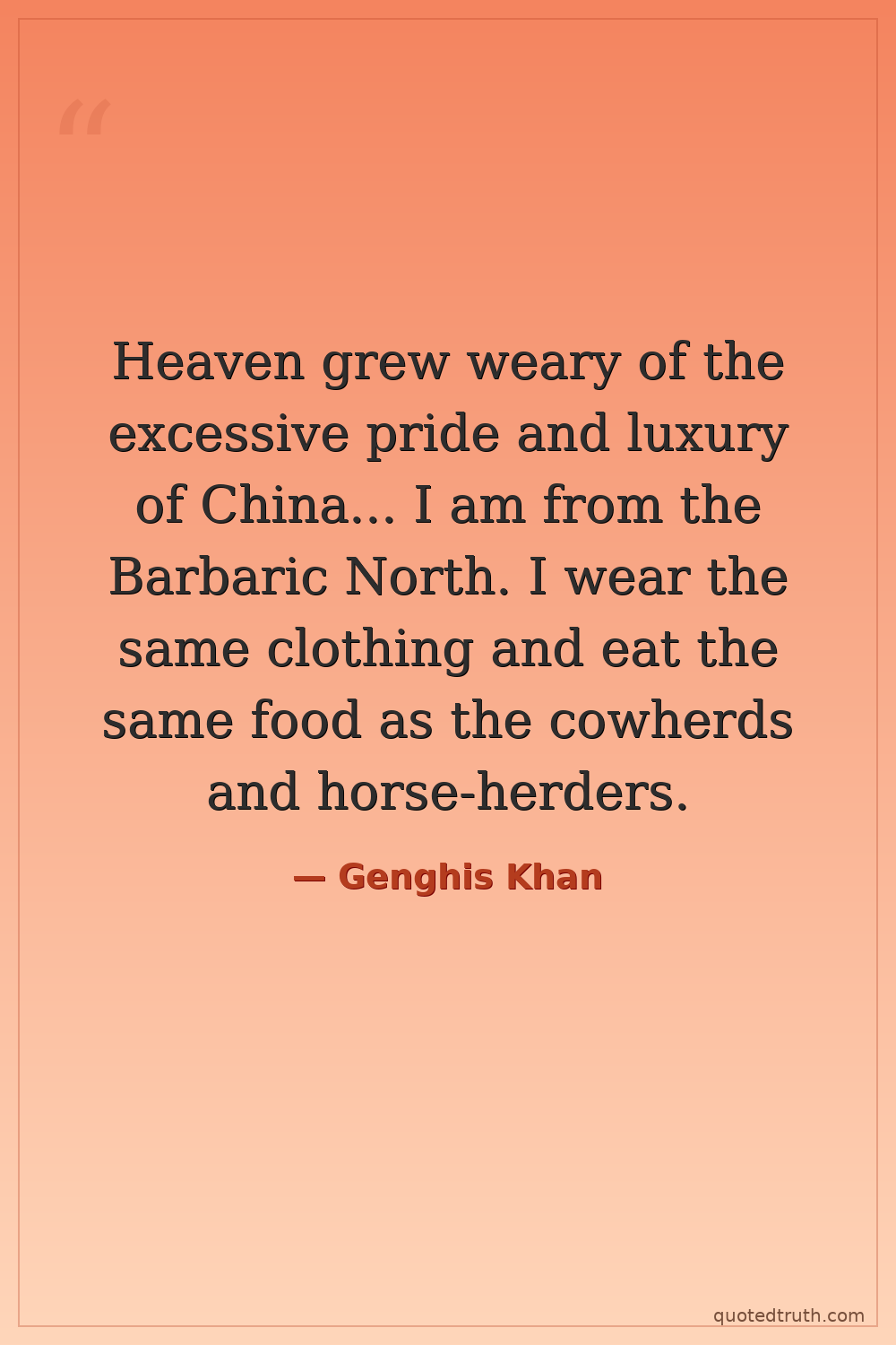 Heaven grew weary of the excessive pride and luxury of China... I am from the Barbaric North. I wear the same clothing and eat the same food as the cowherds and horse-herders.
