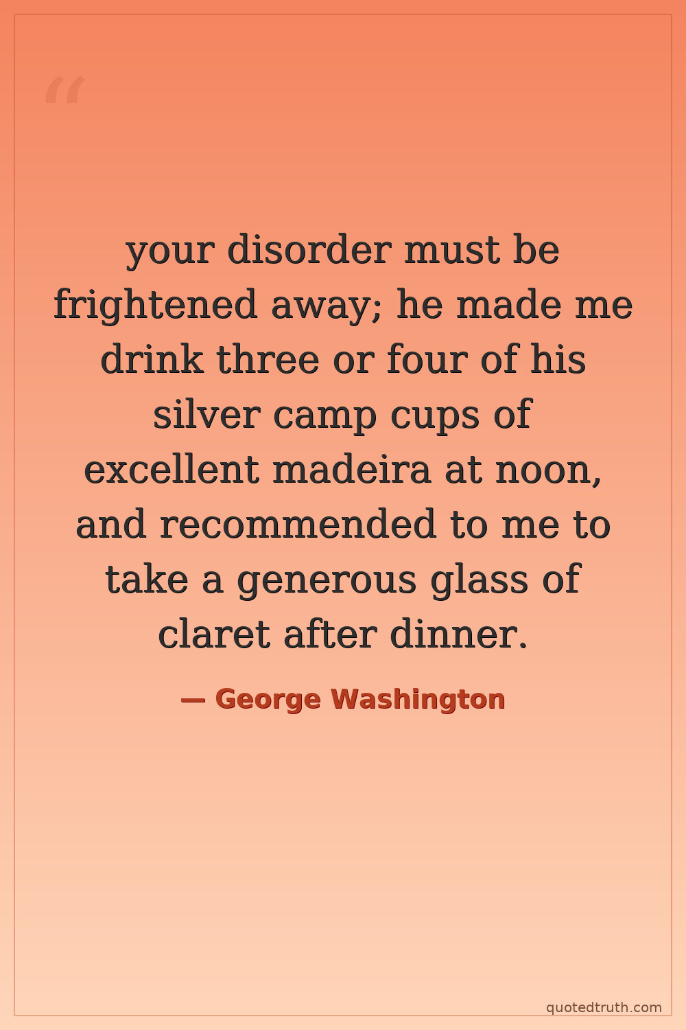your disorder must be frightened away; he made me drink three or four of his silver camp cups of excellent madeira at noon, and recommended to me to take a generous glass of claret after dinner.