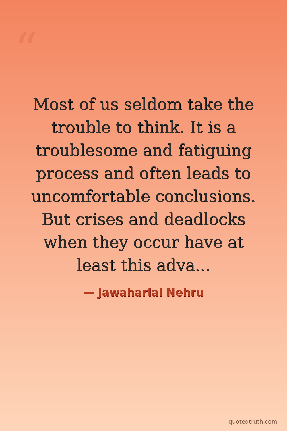 Most of us seldom take the trouble to think. It is a troublesome and fatiguing process and often leads to uncomfortable conclusions. But crises and deadlocks when they occur have at least this advantage, that they force us to think.