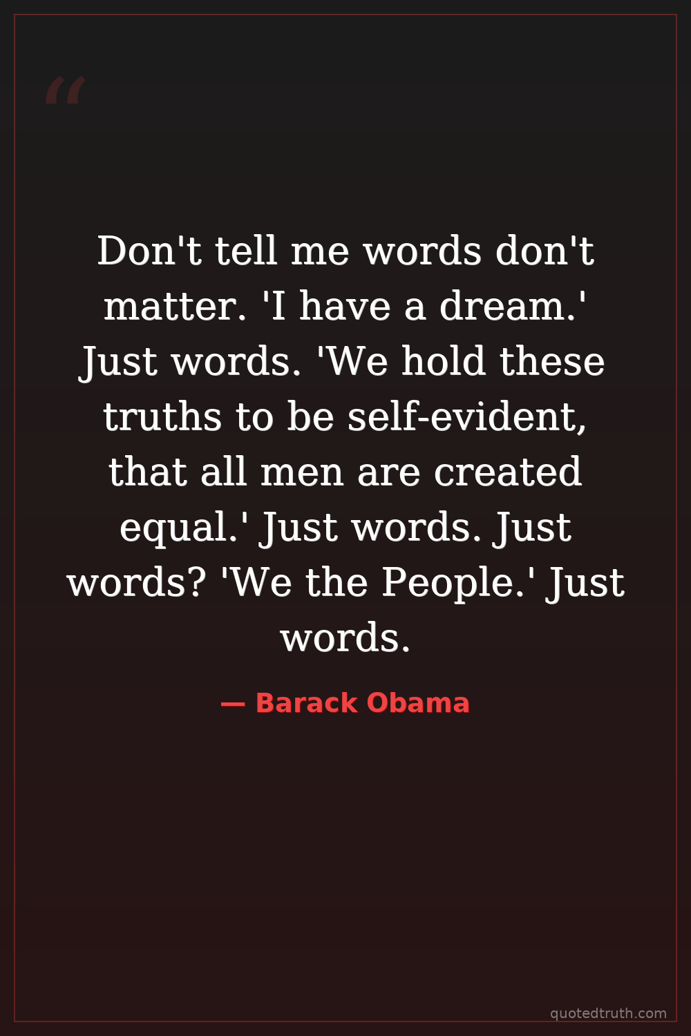 Don't tell me words don't matter. 'I have a dream.' Just words. 'We hold these truths to be self-evident, that all men are created equal.' Just words. Just words? 'We the People.' Just words.