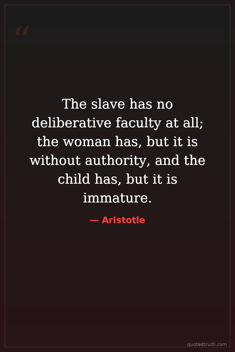 The slave has no deliberative faculty at all; the woman has, but it is without authority, and the child has, but it is immature.