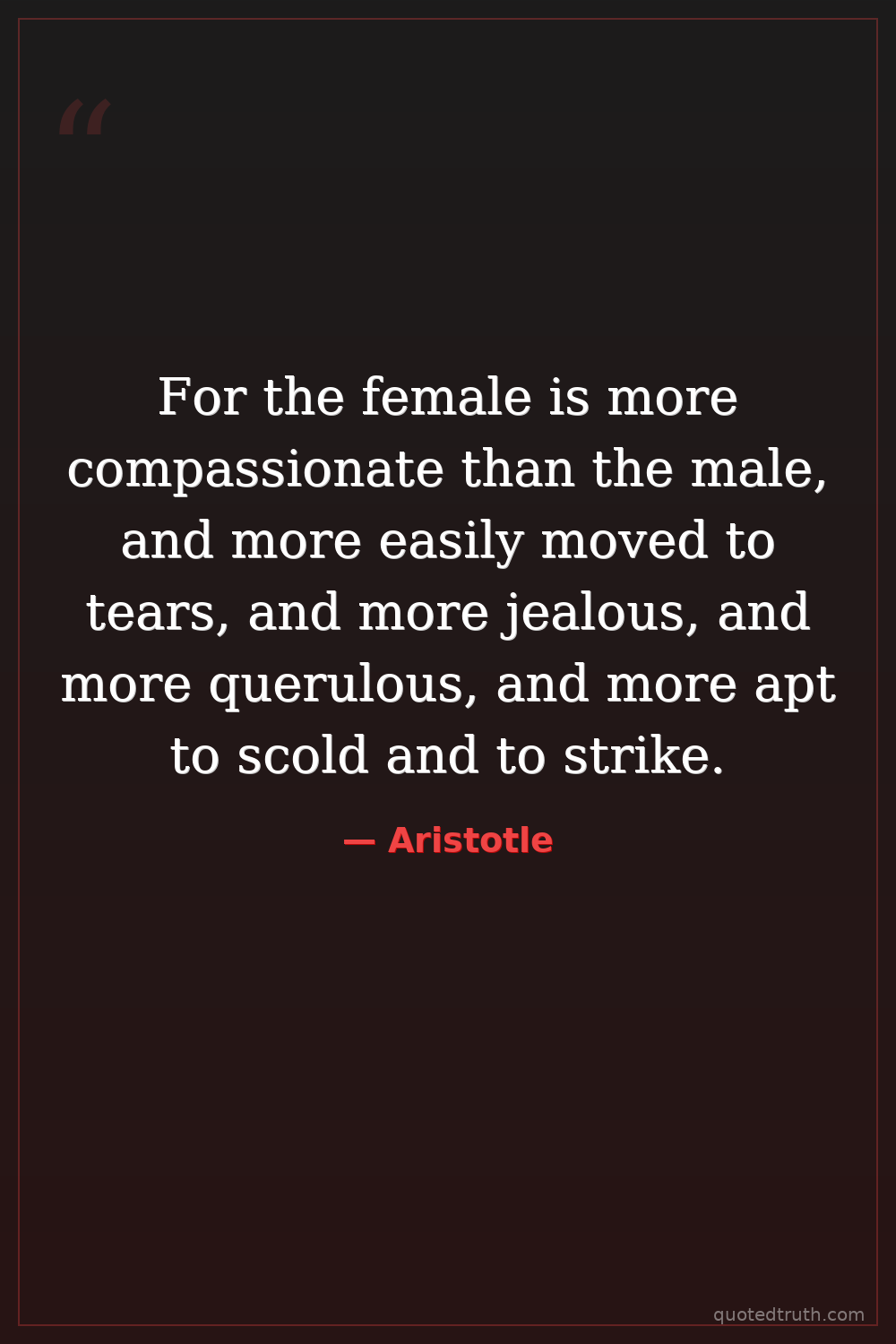 For the female is more compassionate than the male, and more easily moved to tears, and more jealous, and more querulous, and more apt to scold and to strike.