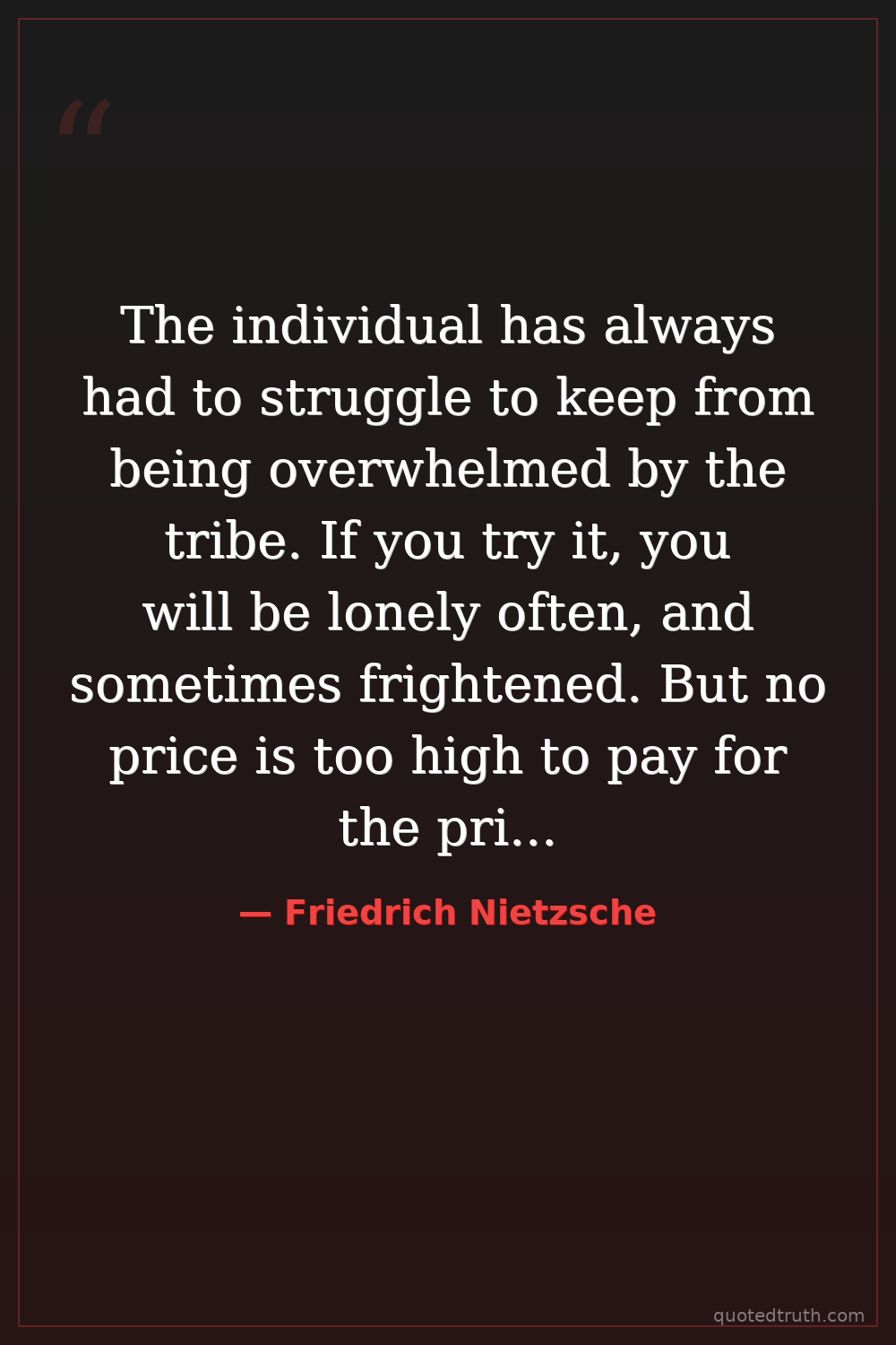 The individual has always had to struggle to keep from being overwhelmed by the tribe. If you try it, you will be lonely often, and sometimes frightened. But no price is too high to pay for the privilege of owning yourself. — Friedrich Nietzsche Modern God is dead, existentialism