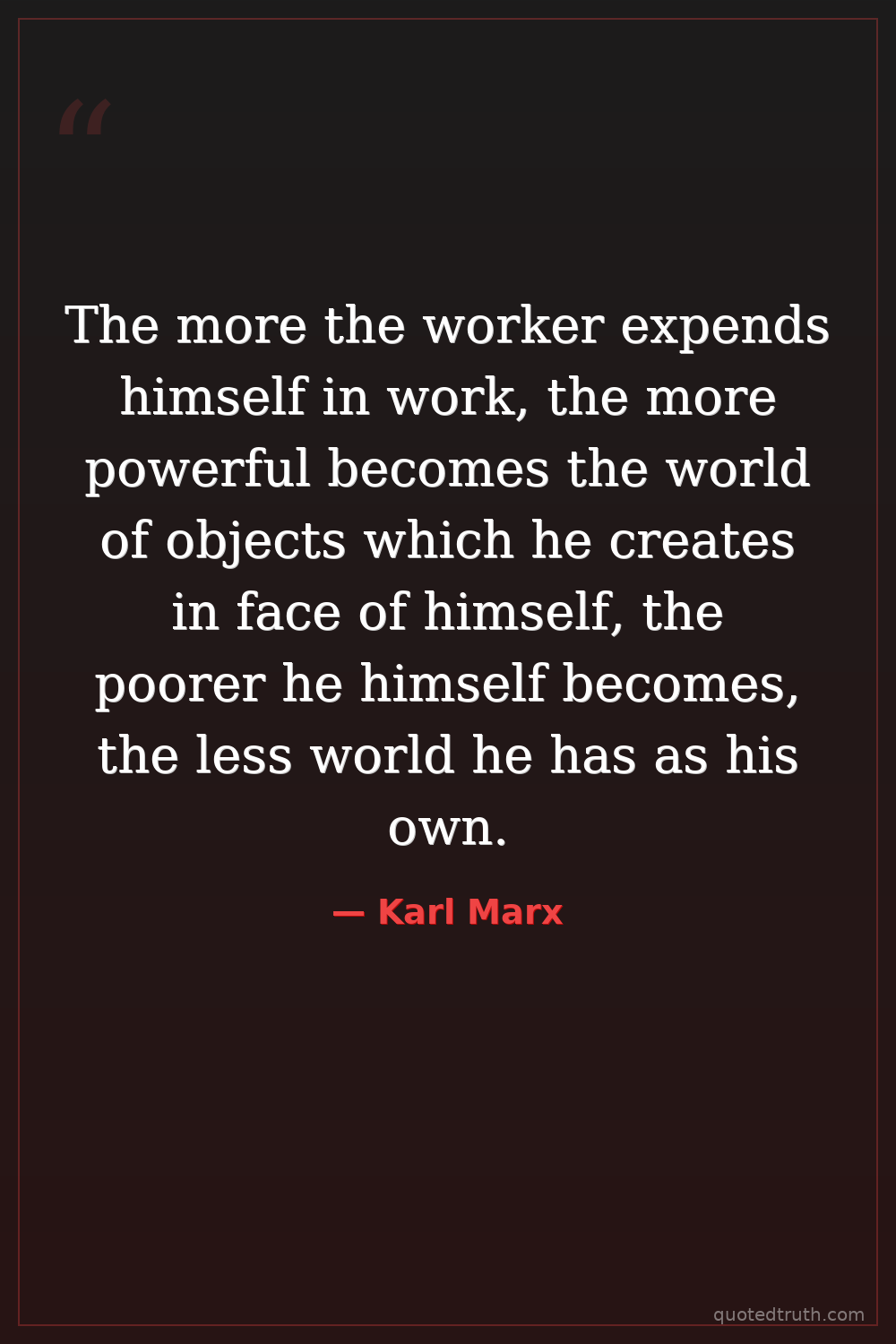 The more the worker expends himself in work, the more powerful becomes the world of objects which he creates in face of himself, the poorer he himself becomes, the less world he has as his own.