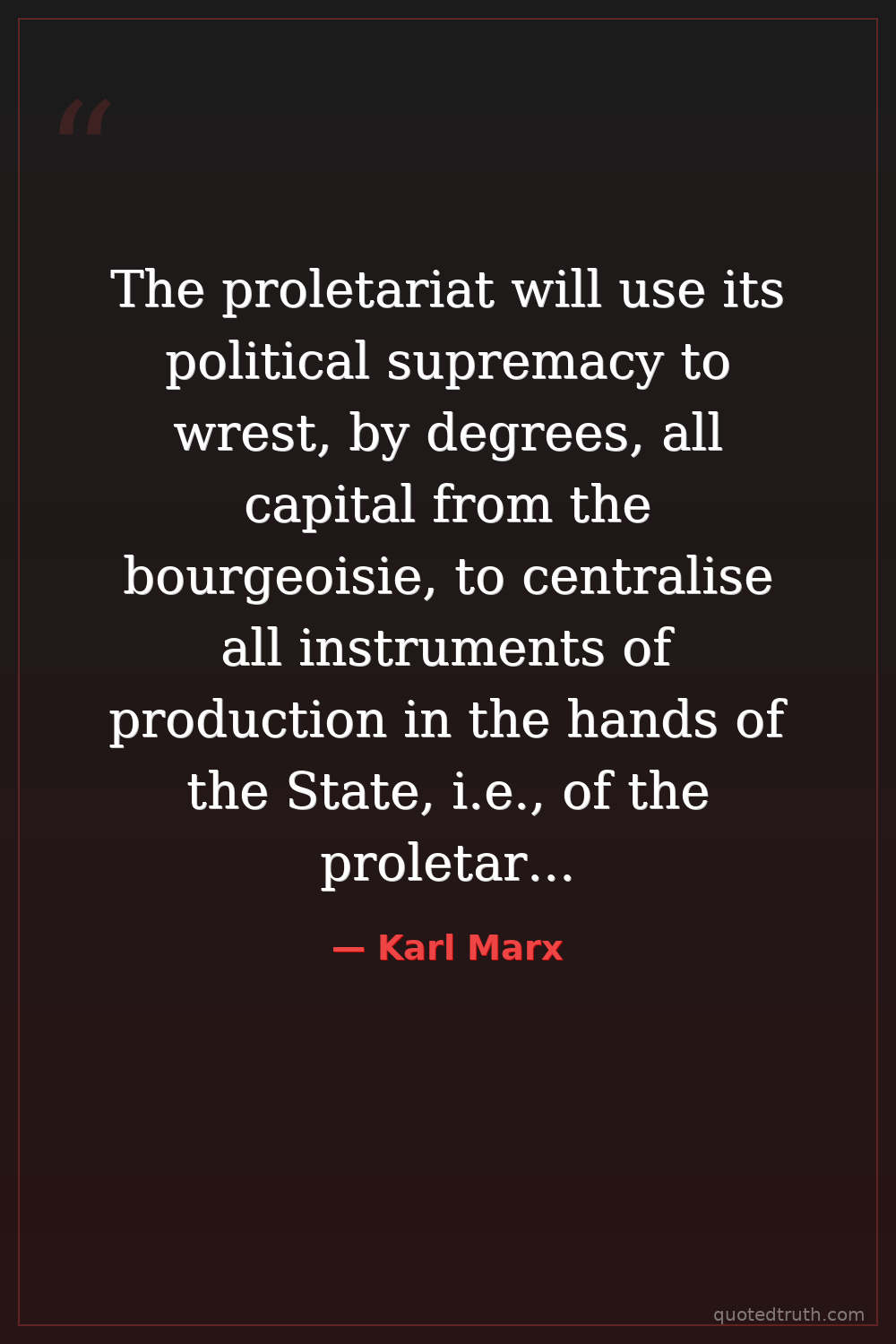 The proletariat will use its political supremacy to wrest, by degrees, all capital from the bourgeoisie, to centralise all instruments of production in the hands of the State, i.e., of the proletariat organised as the ruling class; and to increase the total productive forces as rapidly as possible.