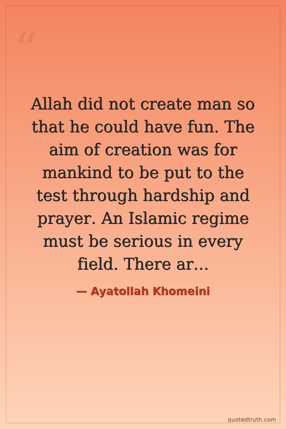 Allah did not create man so that he could have fun. The aim of creation was for mankind to be put to the test through hardship and prayer. An Islamic regime must be serious in every field. There are no jokes in Islam. There is no humor in Islam. There is no fun in Islam. There can be no fun and joy in whatever is serious. Islam does not allow swimming in the sea and is opposed to radio and television serials. Islam, however, allows marksmanship, horseback riding and competition.