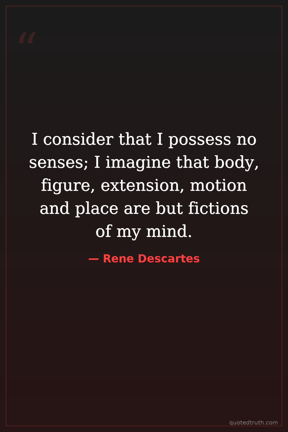 I consider that I possess no senses; I imagine that body, figure, extension, motion and place are but fictions of my mind.
