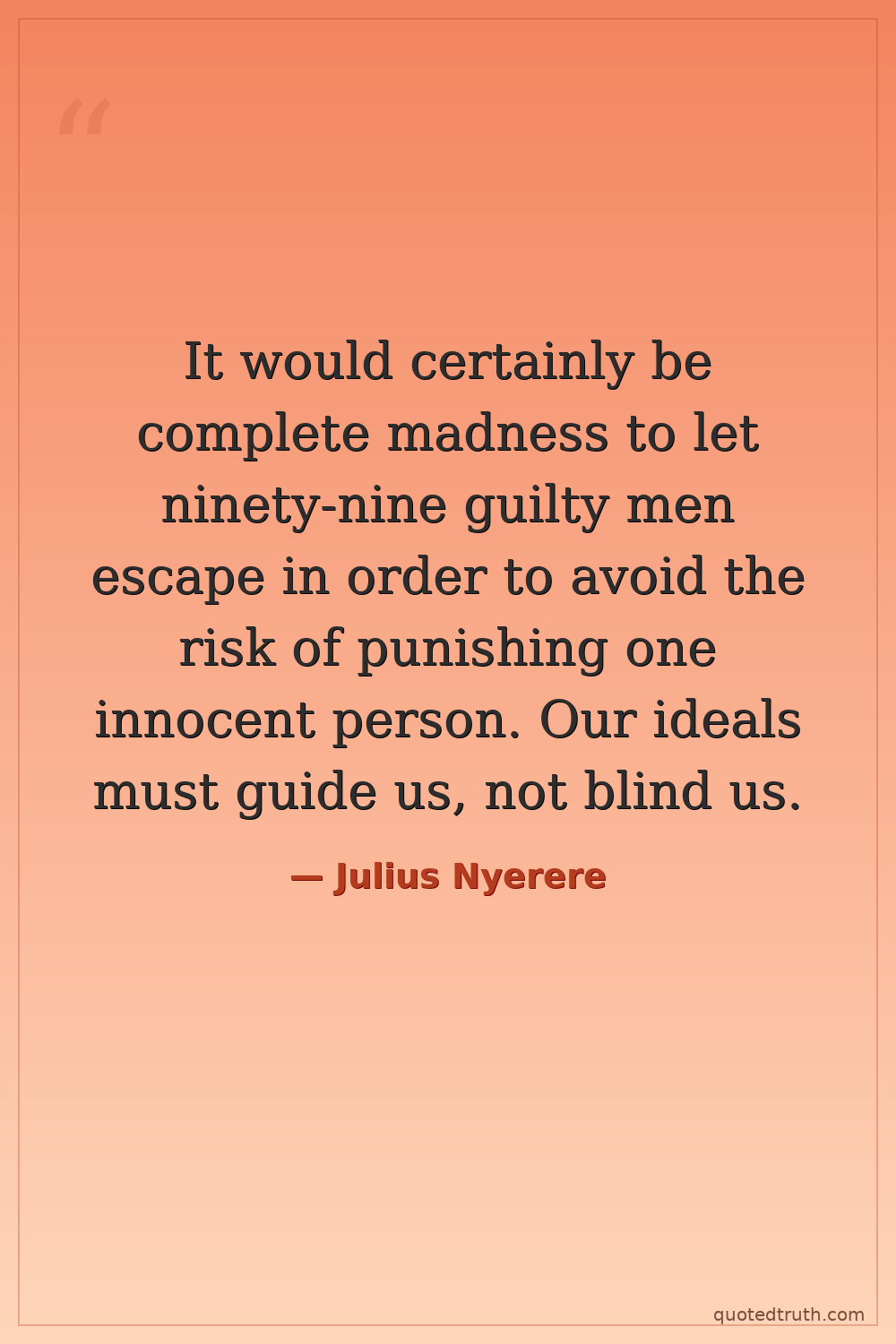 It would certainly be complete madness to let ninety-nine guilty men escape in order to avoid the risk of punishing one innocent person. Our ideals must guide us, not blind us.