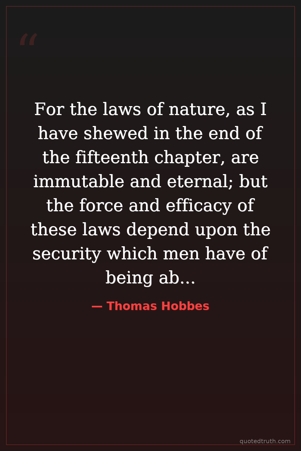 For the laws of nature, as I have shewed in the end of the fifteenth chapter, are immutable and eternal; but the force and efficacy of these laws depend upon the security which men have of being able to perform them.