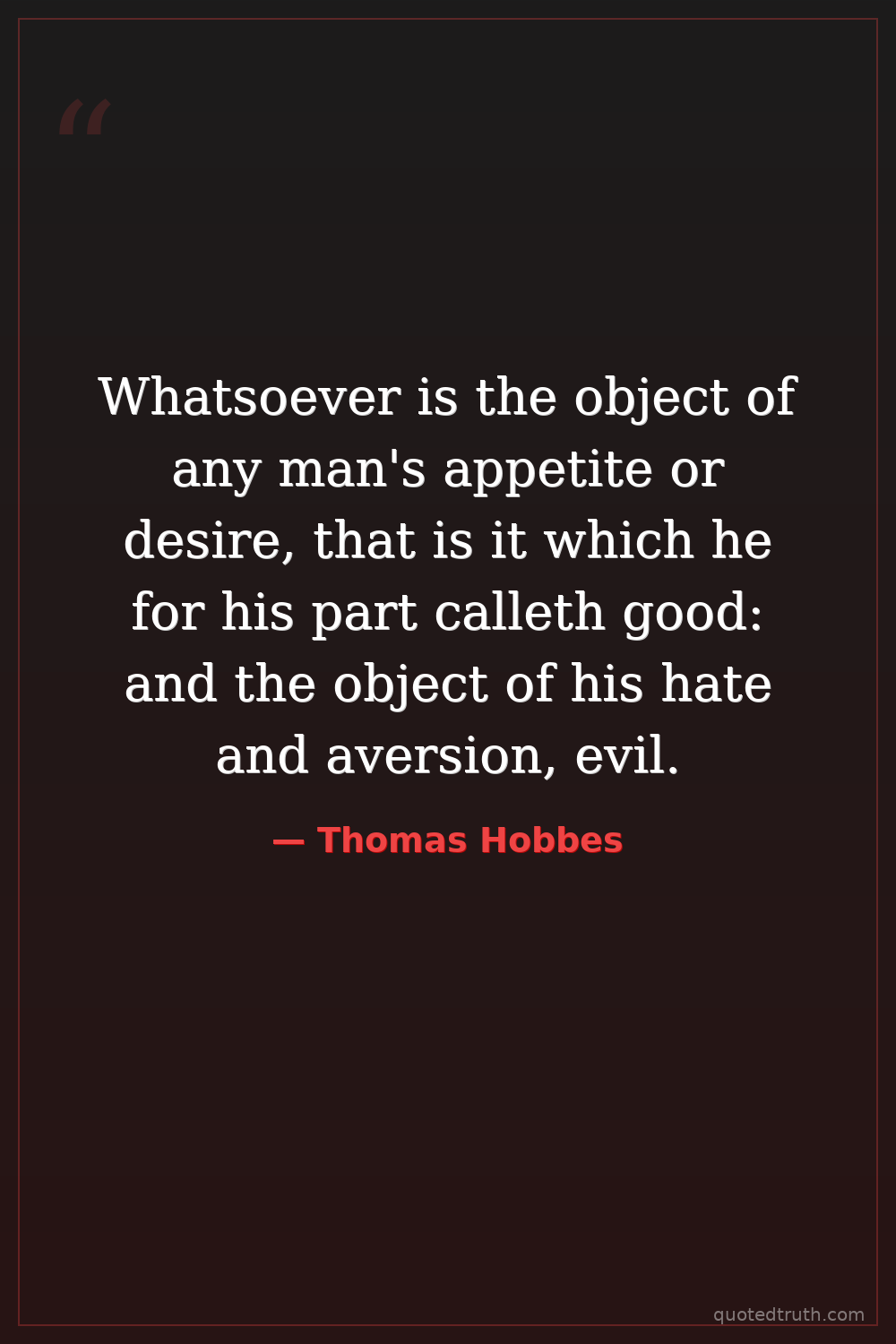 Whatsoever is the object of any man's appetite or desire, that is it which he for his part calleth good: and the object of his hate and aversion, evil.