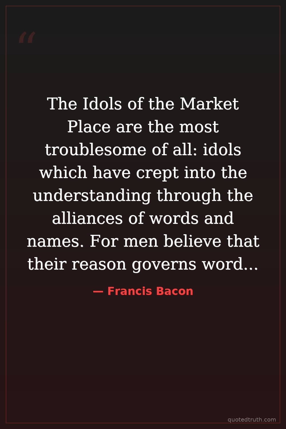 The Idols of the Market Place are the most troublesome of all: idols which have crept into the understanding through the alliances of words and names. For men believe that their reason governs words, but it is also true that words react on the understanding; and this it is that has rendered philosophy and the sciences sophistical and inactive. Words are generally formed and imposed according to the apprehension of the vulgar, and draw lines of division corresponding to popular distinctions. And when a more acute understanding or more diligent observation strives to introduce truer divisions, words stand in the way, and resist the innovation.