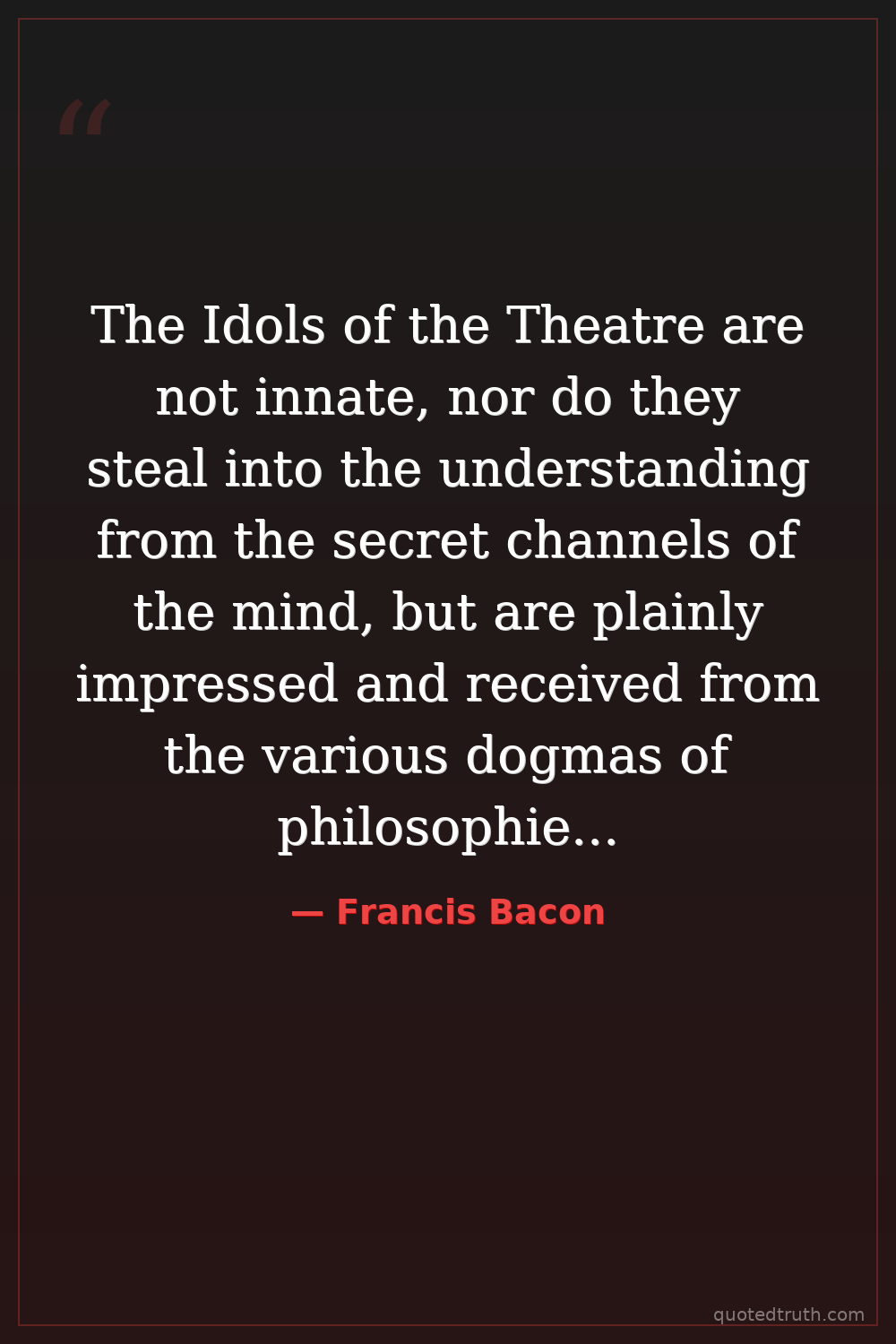 The Idols of the Theatre are not innate, nor do they steal into the understanding from the secret channels of the mind, but are plainly impressed and received from the various dogmas of philosophies, and also from bad rules of demonstration. For so many are the modes of building systems of philosophy, and so various and divergent the ways of collecting and digesting the things which conduce to them, that they are not only several, but also, for the most part, discordant.