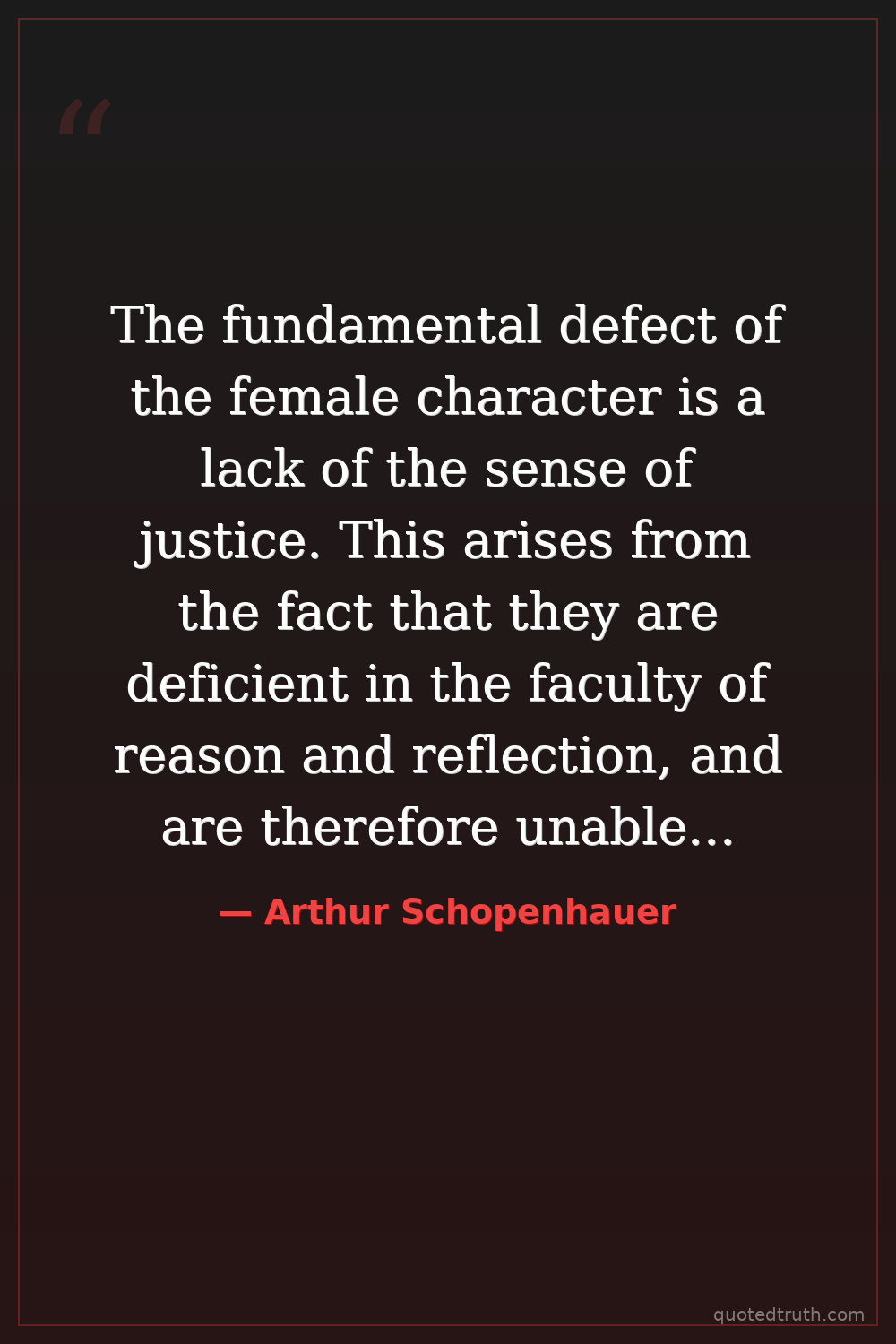 The fundamental defect of the female character is a lack of the sense of justice. This arises from the fact that they are deficient in the faculty of reason and reflection, and are therefore unable to take a comprehensive view of things, but are guided by their momentary impulses and feelings.