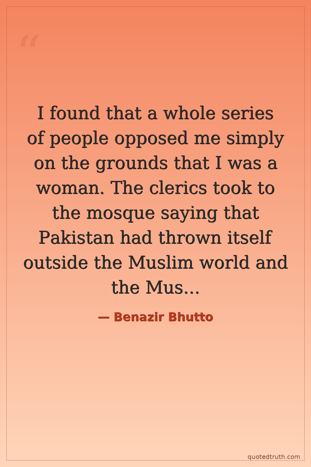 I found that a whole series of people opposed me simply on the grounds that I was a woman. The clerics took to the mosque saying that Pakistan had thrown itself outside the Muslim world and the Muslim umar by voting for a woman, that a woman had usurped a man's place in the Islamic society.