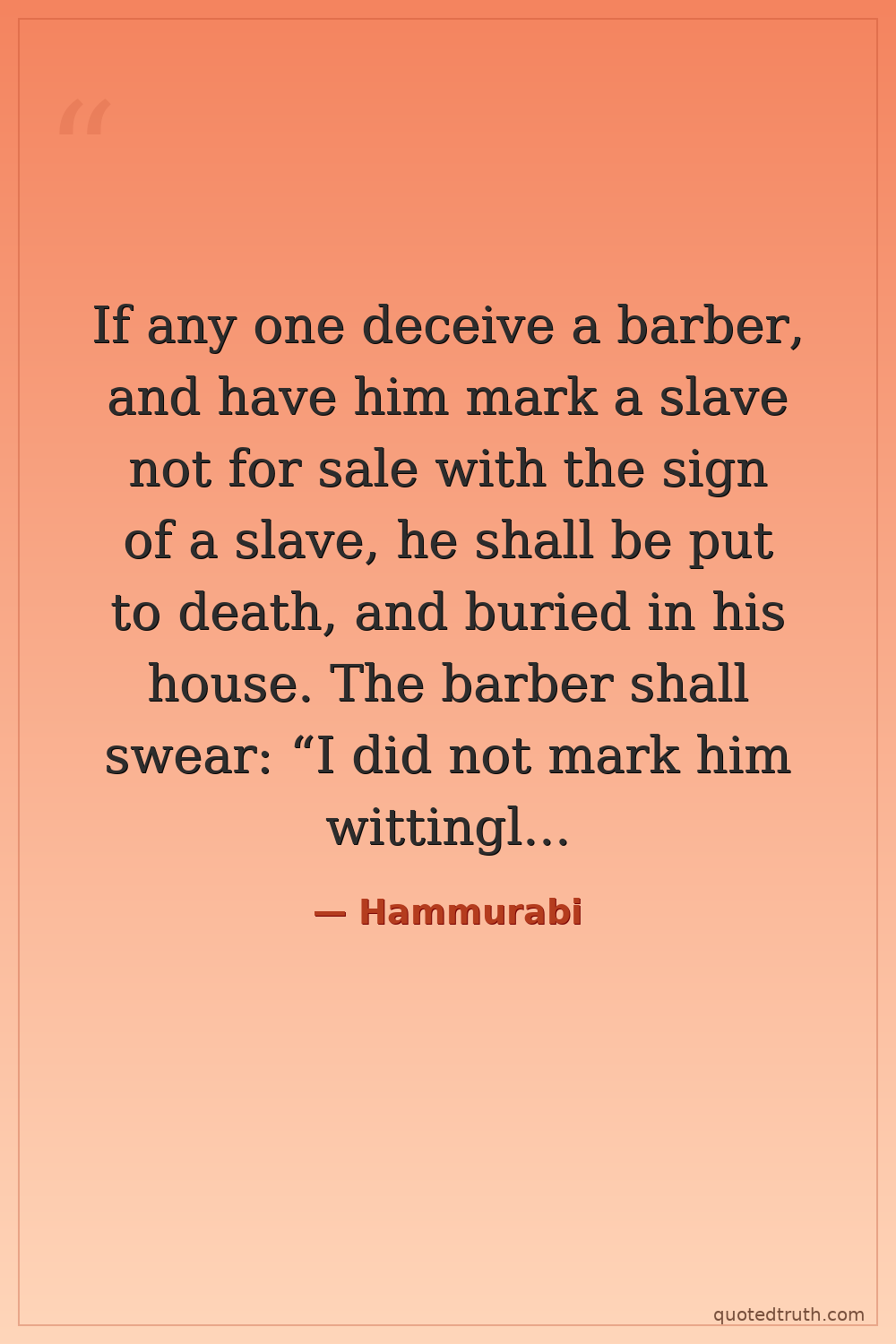 If any one deceive a barber, and have him mark a slave not for sale with the sign of a slave, he shall be put to death, and buried in his house. The barber shall swear: “I did not mark him wittingly,” and shall be guiltless.