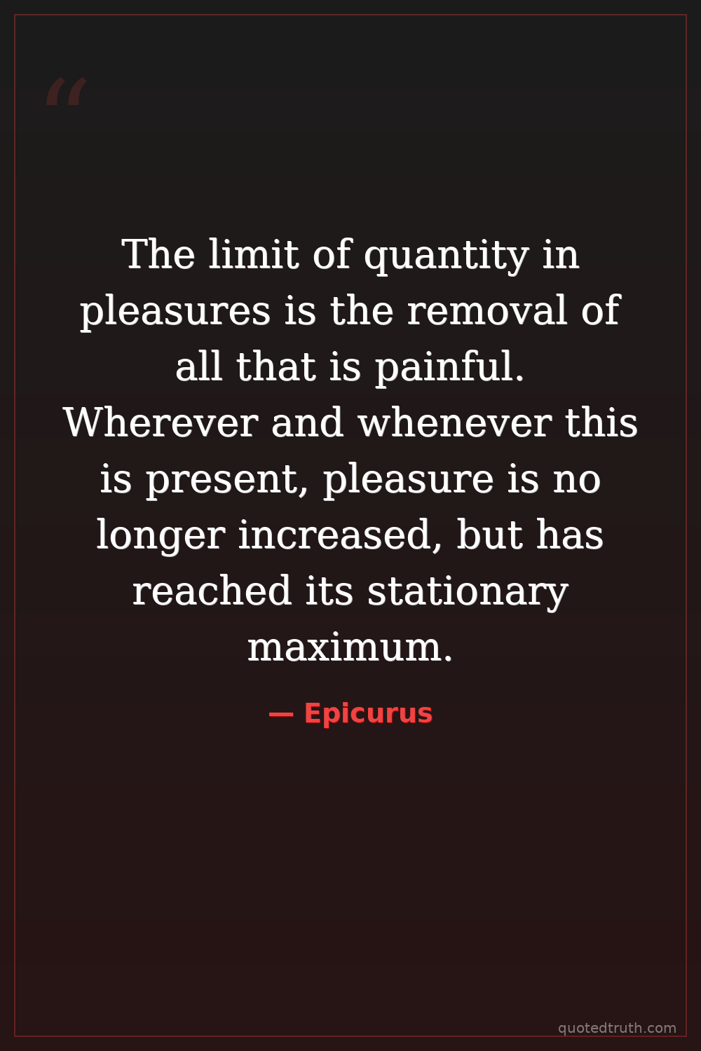The limit of quantity in pleasures is the removal of all that is painful. Wherever and whenever this is present, pleasure is no longer increased, but has reached its stationary maximum.
