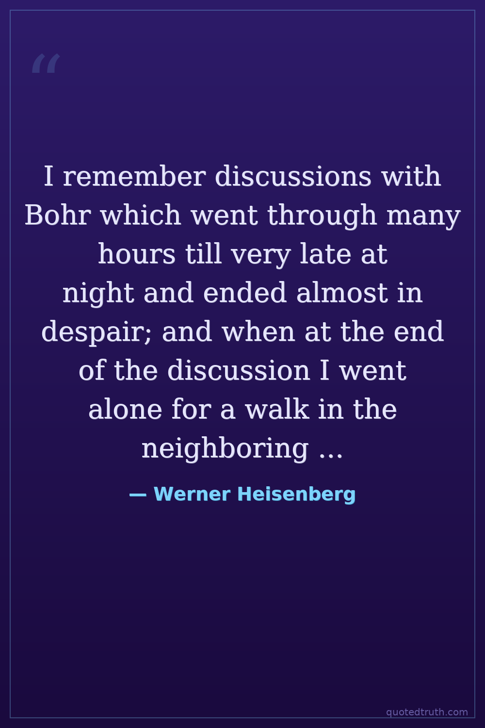 I remember discussions with Bohr which went through many hours till very late at night and ended almost in despair; and when at the end of the discussion I went alone for a walk in the neighboring park, I repeated to myself again and again the question: Can nature possibly be as absurd as it seemed to us in these atomic experiments?