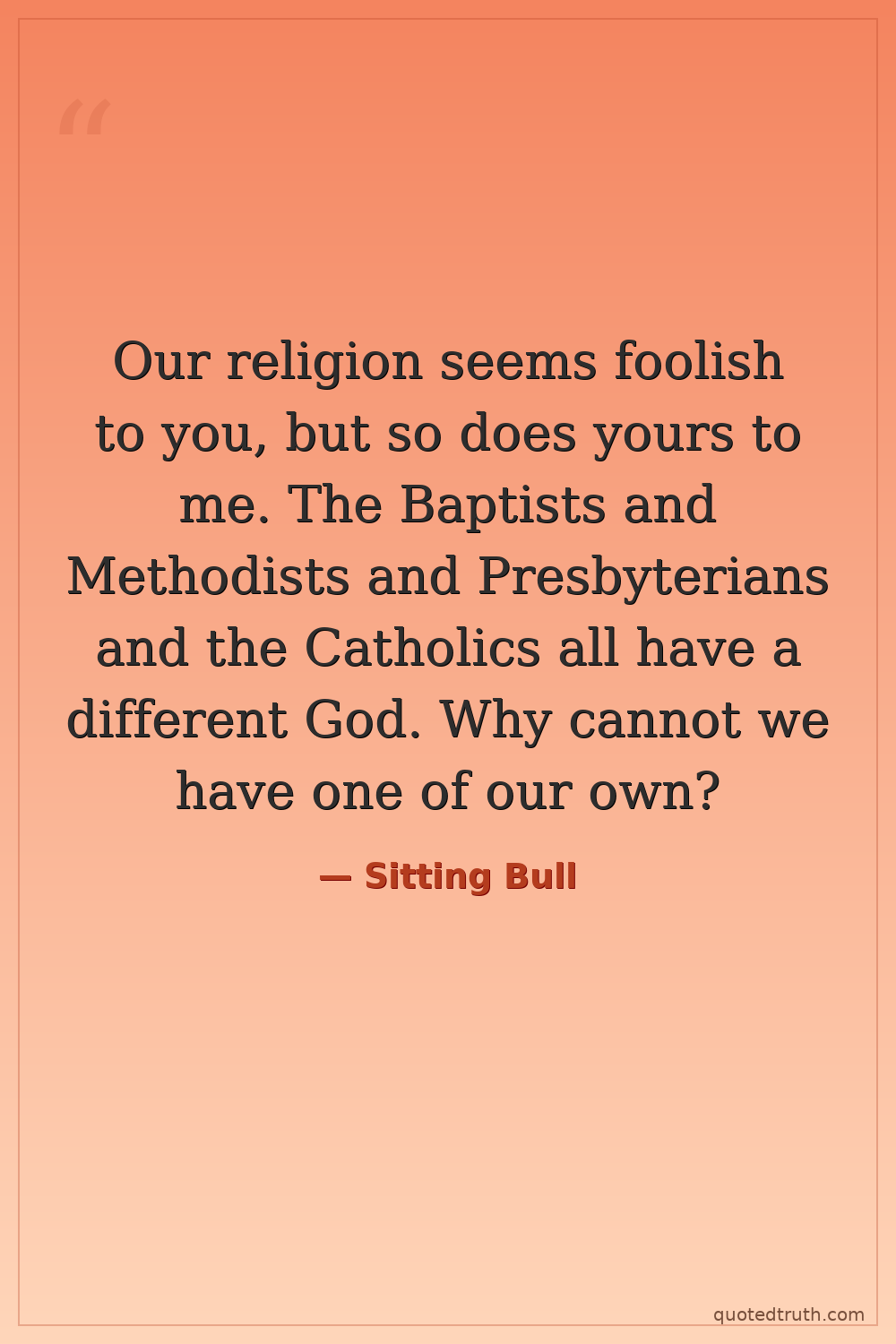 Our religion seems foolish to you, but so does yours to me. The Baptists and Methodists and Presbyterians and the Catholics all have a different God. Why cannot we have one of our own?