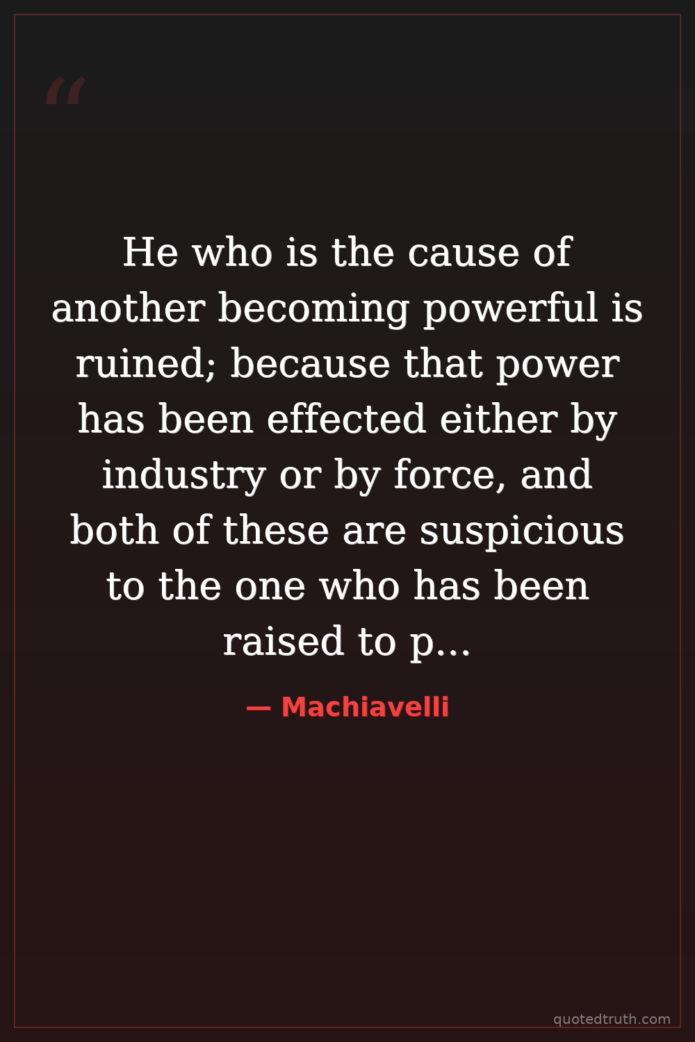 He who is the cause of another becoming powerful is ruined; because that power has been effected either by industry or by force, and both of these are suspicious to the one who has been raised to power.