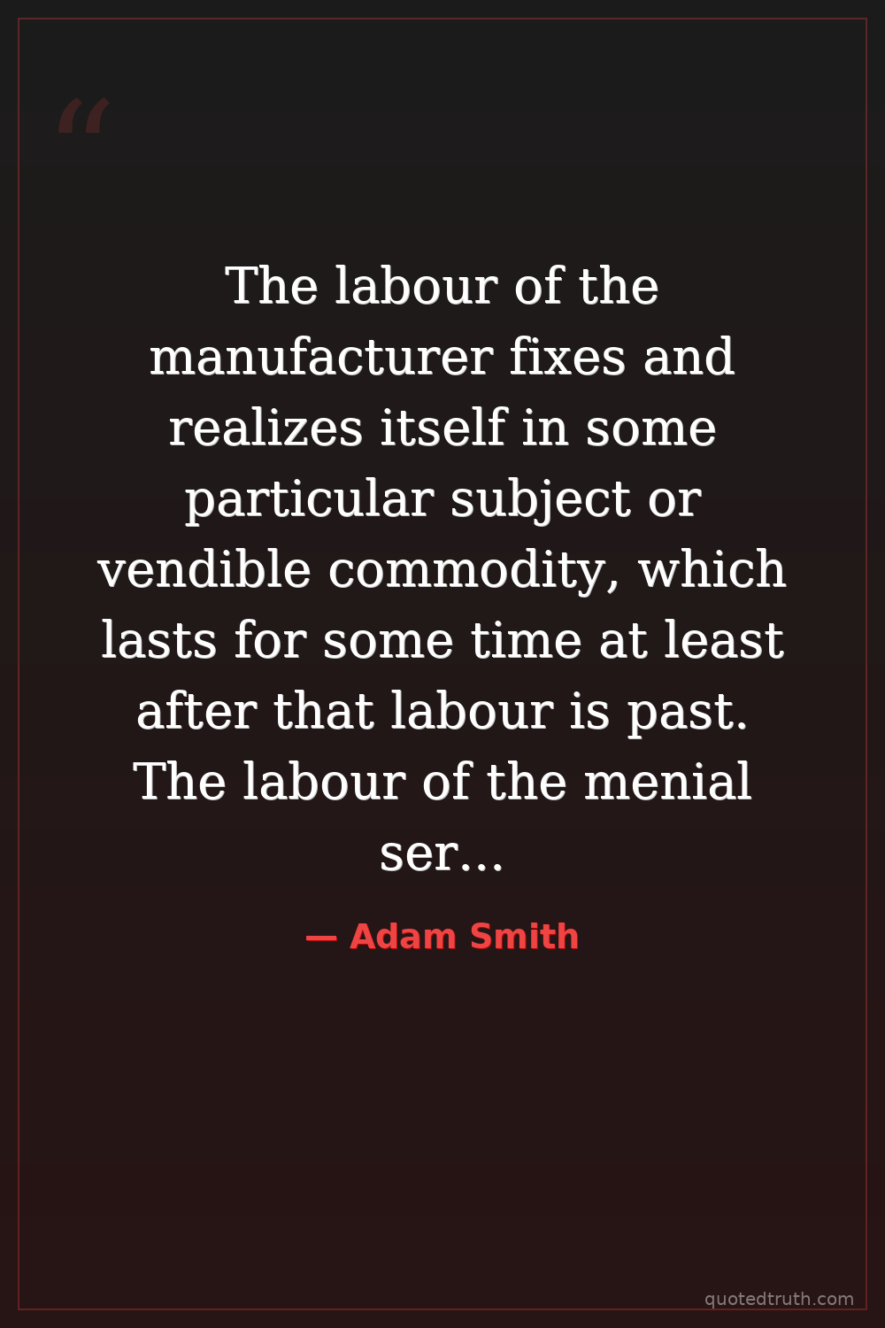 The labour of the manufacturer fixes and realizes itself in some particular subject or vendible commodity, which lasts for some time at least after that labour is past. The labour of the menial servant, on the contrary, does not fix or realize itself in any particular subject or vendible commodity. His services generally perish in the very instant of their performance, and seldom leave any trace or value behind them for which an equal quantity of service could afterwards be procured.