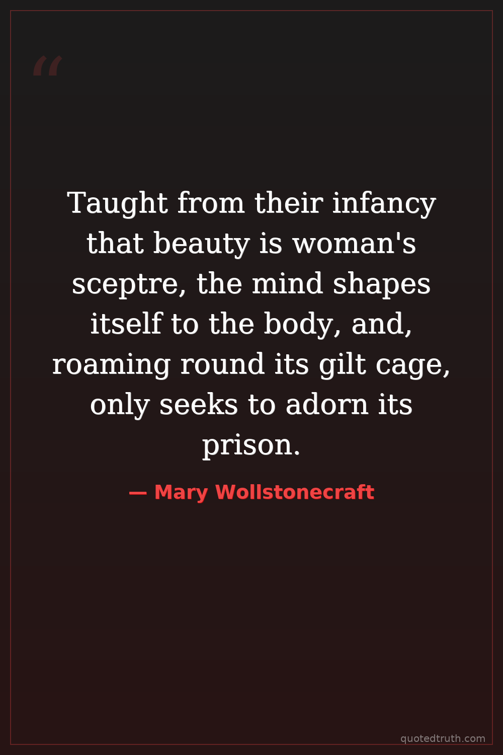 Taught from their infancy that beauty is woman's sceptre, the mind shapes itself to the body, and, roaming round its gilt cage, only seeks to adorn its prison.