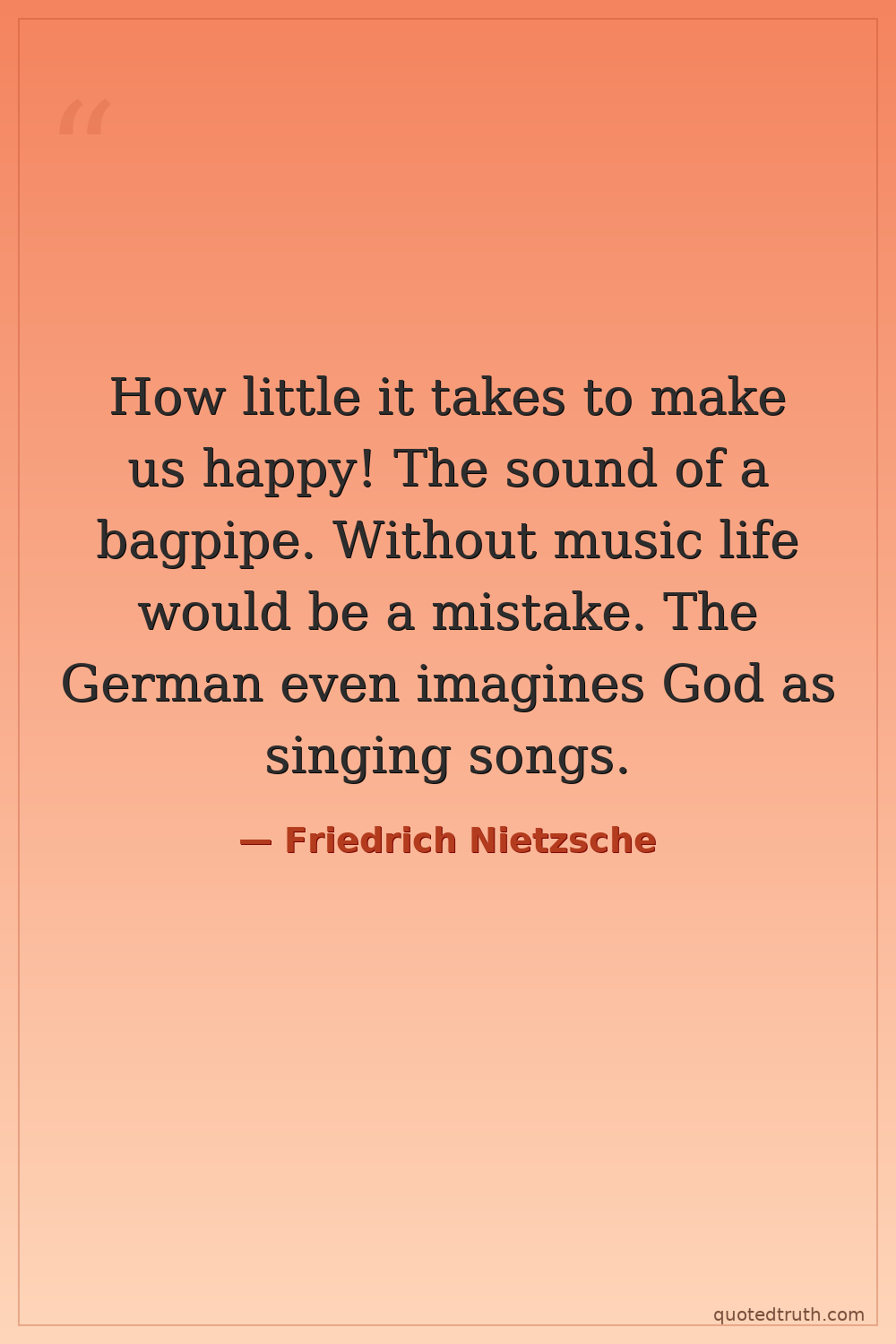 How little it takes to make us happy! The sound of a bagpipe. Without music life would be a mistake. The German even imagines God as singing songs.