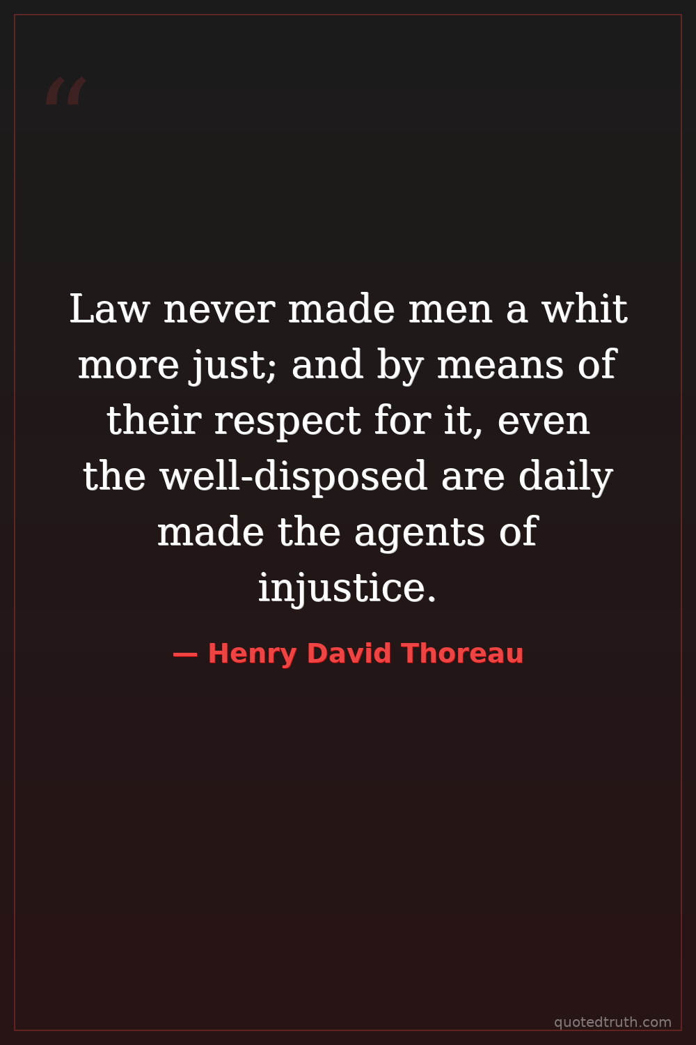 Law never made men a whit more just; and by means of their respect for it, even the well-disposed are daily made the agents of injustice.
