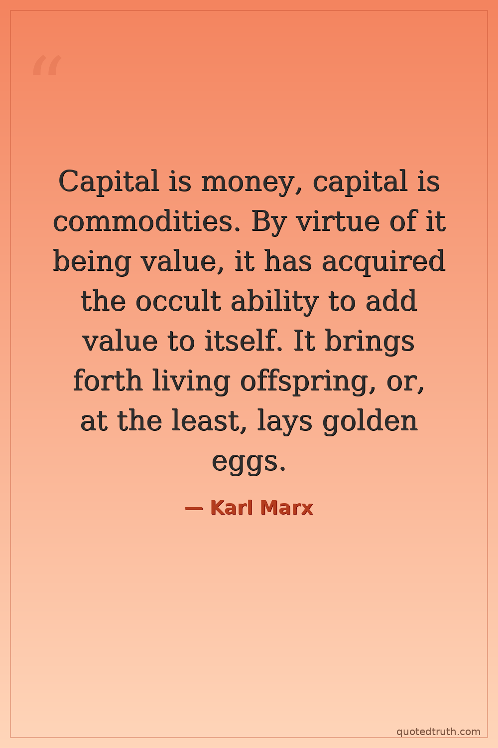 Capital is money, capital is commodities. By virtue of it being value, it has acquired the occult ability to add value to itself. It brings forth living offspring, or, at the least, lays golden eggs.
