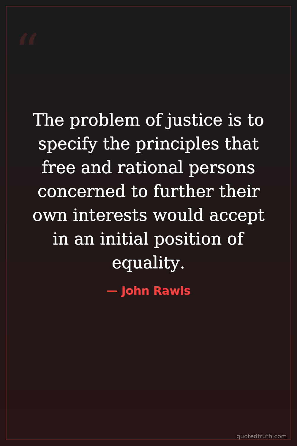 The problem of justice is to specify the principles that free and rational persons concerned to further their own interests would accept in an initial position of equality.