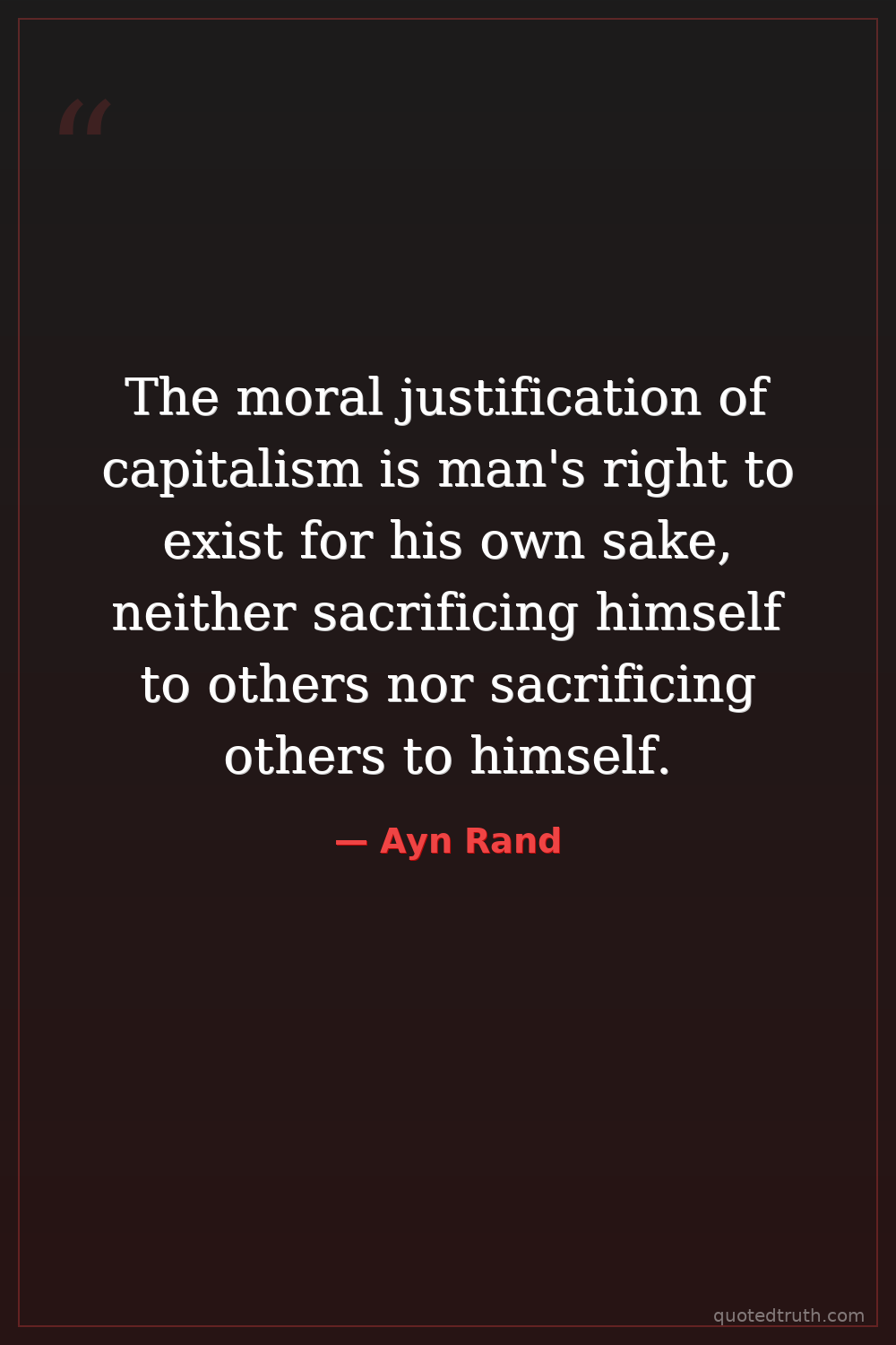 The moral justification of capitalism is man's right to exist for his own sake, neither sacrificing himself to others nor sacrificing others to himself.