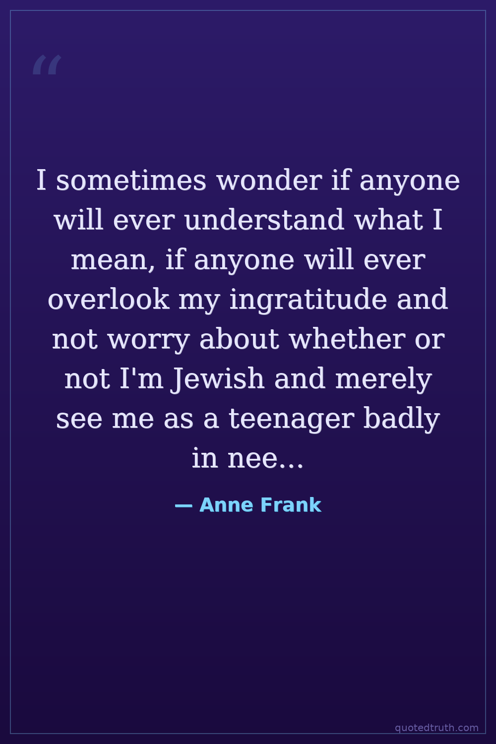 I sometimes wonder if anyone will ever understand what I mean, if anyone will ever overlook my ingratitude and not worry about whether or not I'm Jewish and merely see me as a teenager badly in need of some good, plain fun.