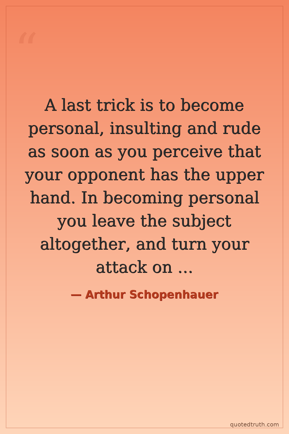 A last trick is to become personal, insulting and rude as soon as you perceive that your opponent has the upper hand. In becoming personal you leave the subject altogether, and turn your attack on the person by remarks of an offensive and spiteful character. This is a very popular trick, because everyone is able to carry it into effect.