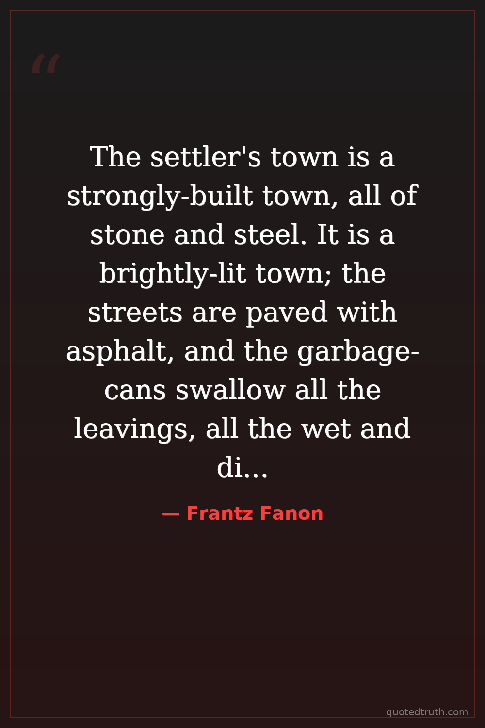 The settler's town is a strongly-built town, all of stone and steel. It is a brightly-lit town; the streets are paved with asphalt, and the garbage-cans swallow all the leavings, all the wet and dirty garbage which the settler's refuse to touch. The settler's feet are never visible, except perhaps in the sea; but there you're sure to find no dirt. The settler's town is a town of white people, of foreigners.