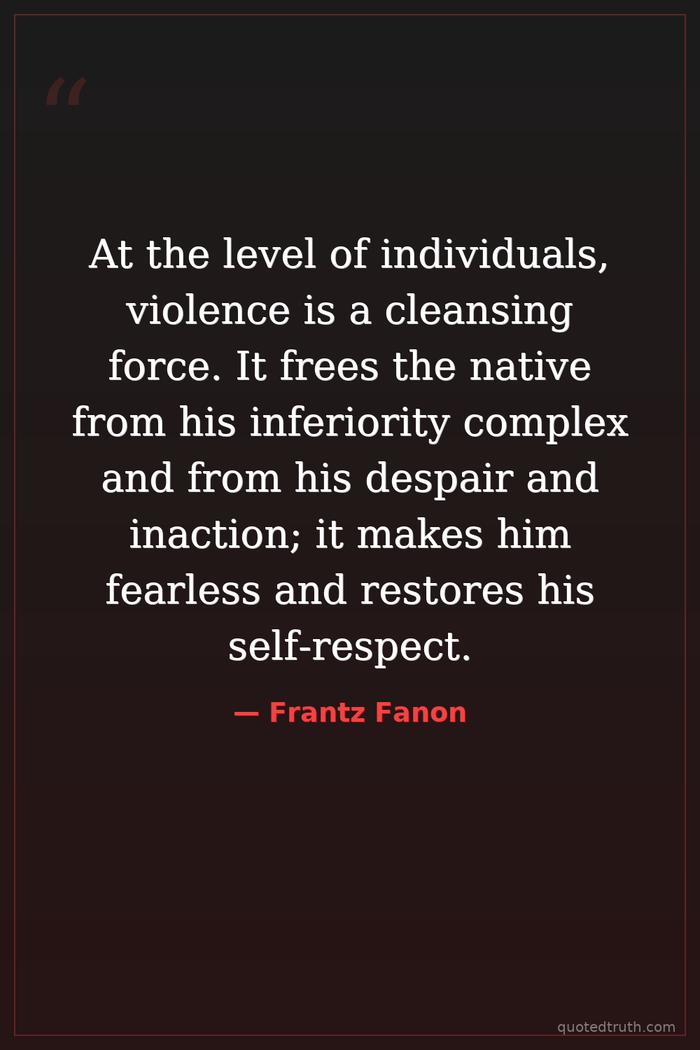 At the level of individuals, violence is a cleansing force. It frees the native from his inferiority complex and from his despair and inaction; it makes him fearless and restores his self-respect.