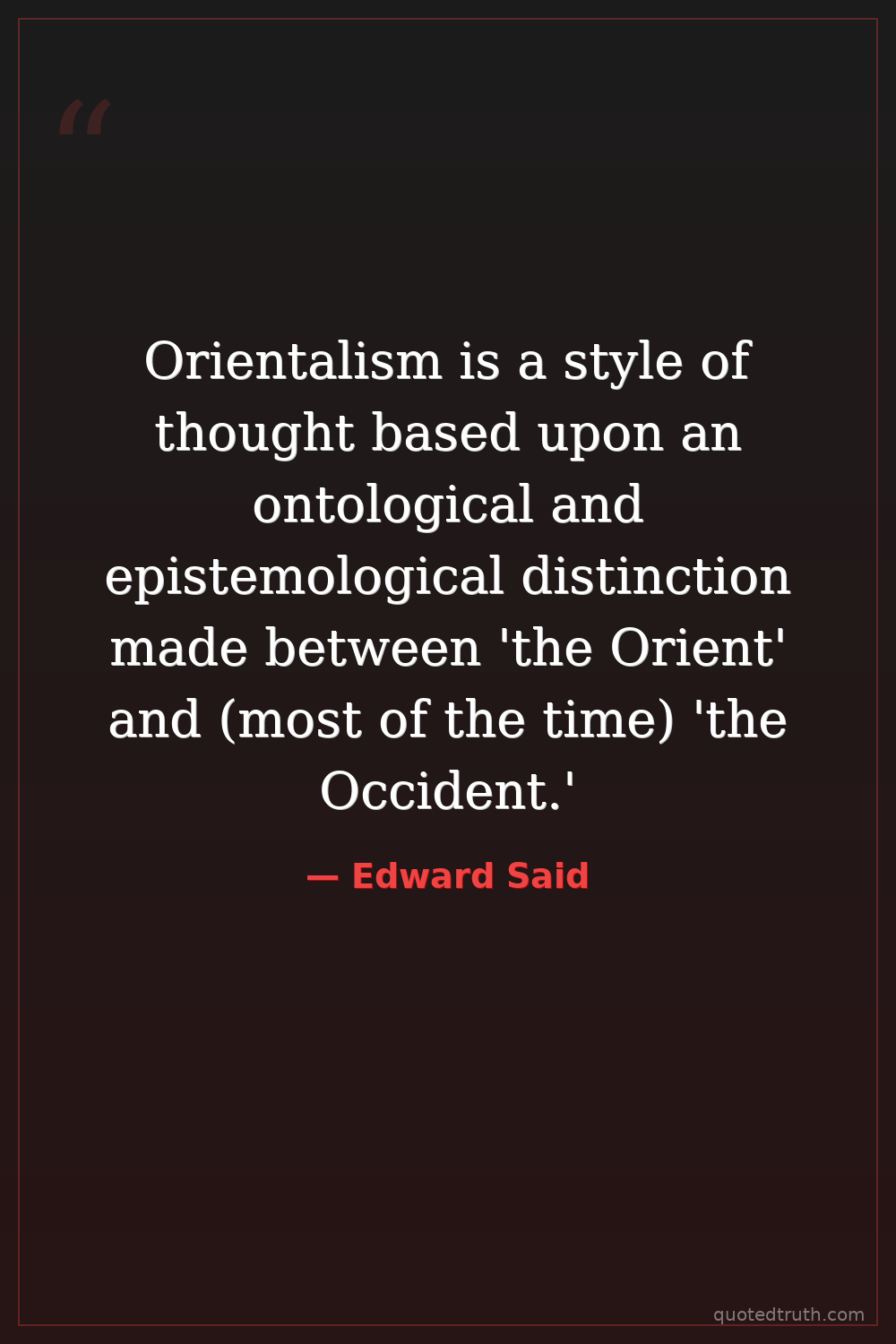 Orientalism is a style of thought based upon an ontological and epistemological distinction made between 'the Orient' and (most of the time) 'the Occident.'