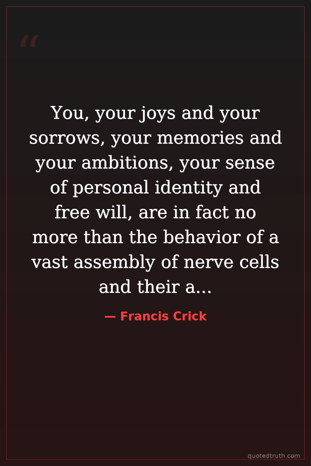 You, your joys and your sorrows, your memories and your ambitions, your sense of personal identity and free will, are in fact no more than the behavior of a vast assembly of nerve cells and their associated molecules.