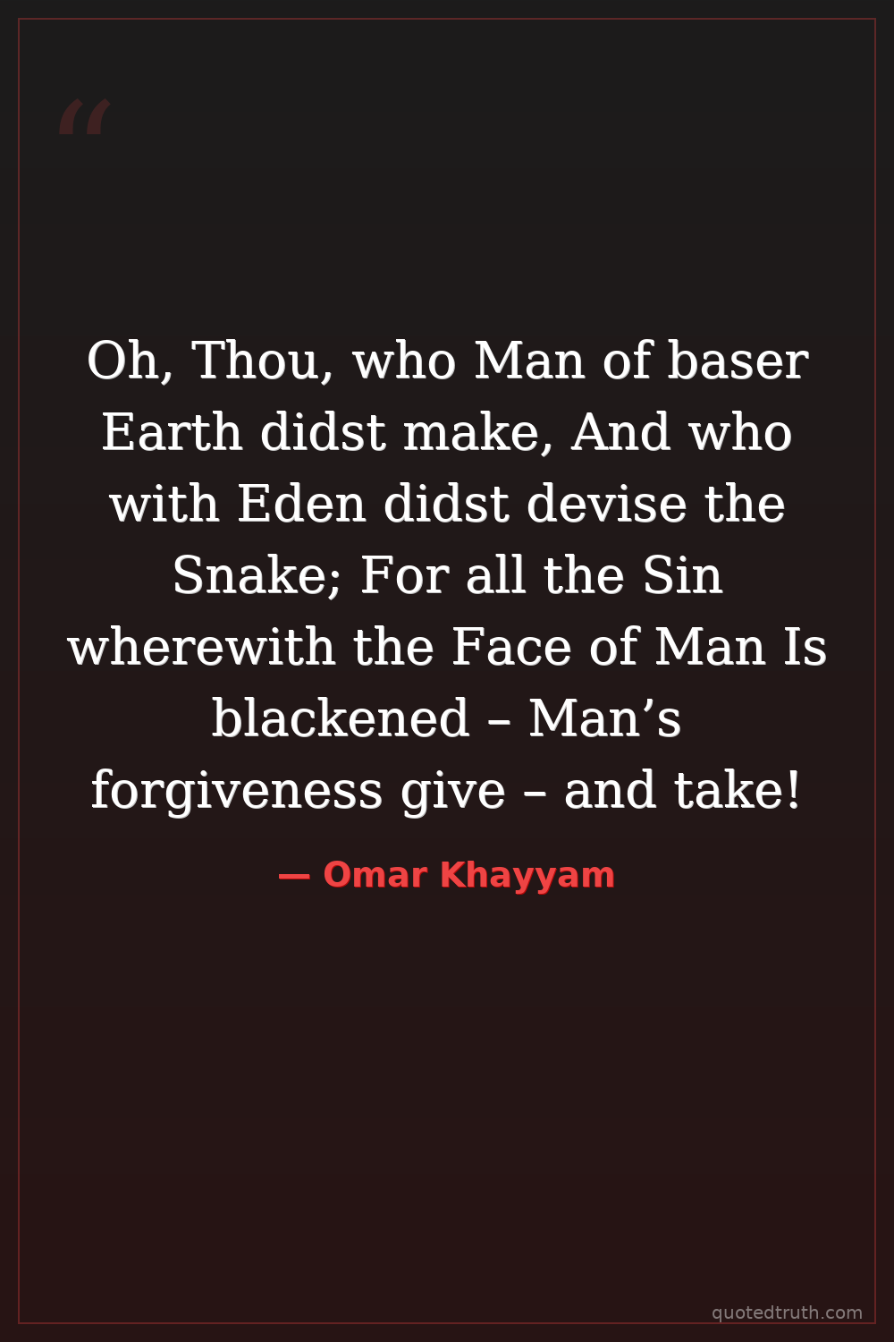 Oh, Thou, who Man of baser Earth didst make, And who with Eden didst devise the Snake; For all the Sin wherewith the Face of Man Is blackened – Man’s forgiveness give – and take!