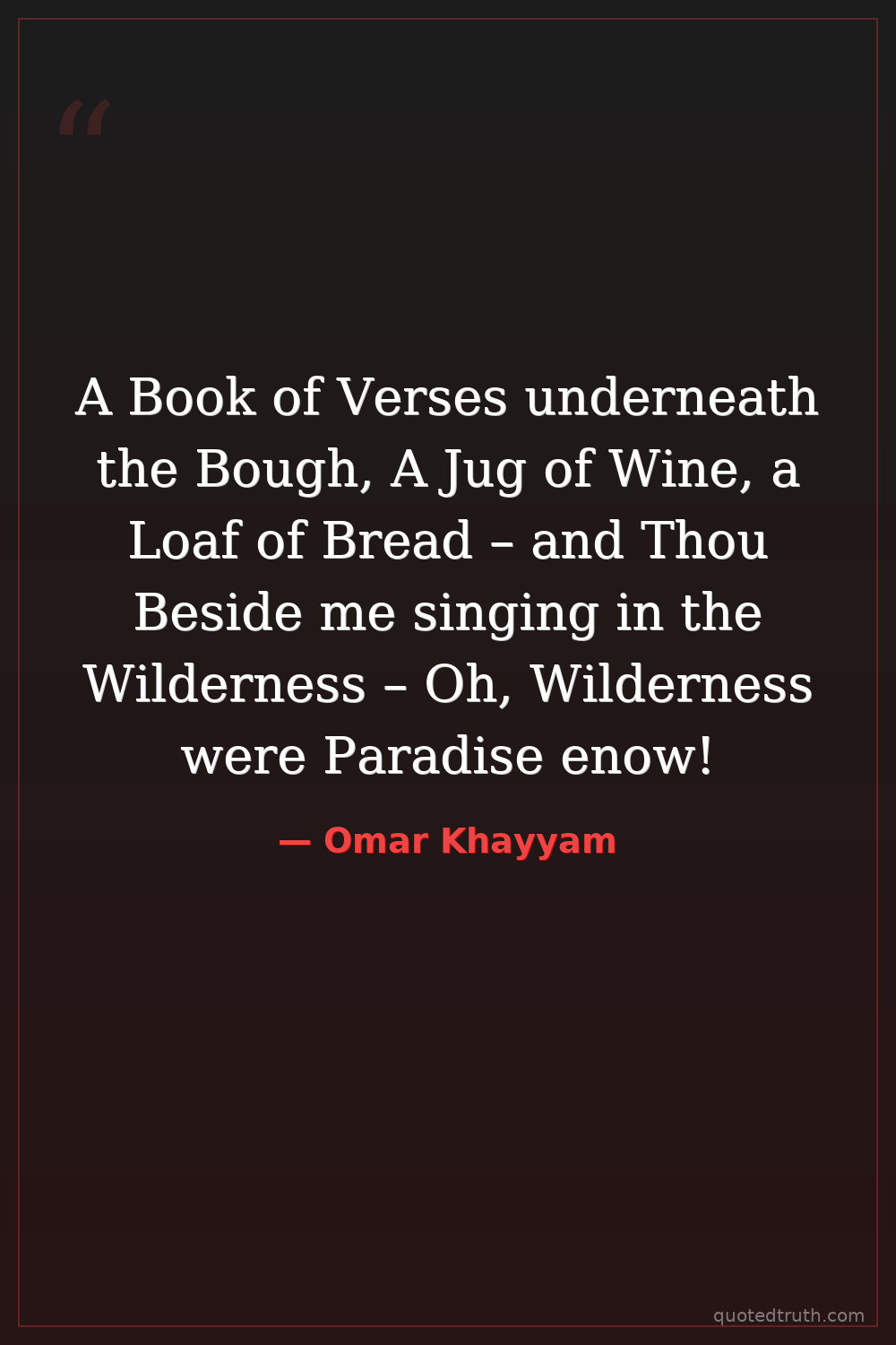 A Book of Verses underneath the Bough, A Jug of Wine, a Loaf of Bread – and Thou Beside me singing in the Wilderness – Oh, Wilderness were Paradise enow!