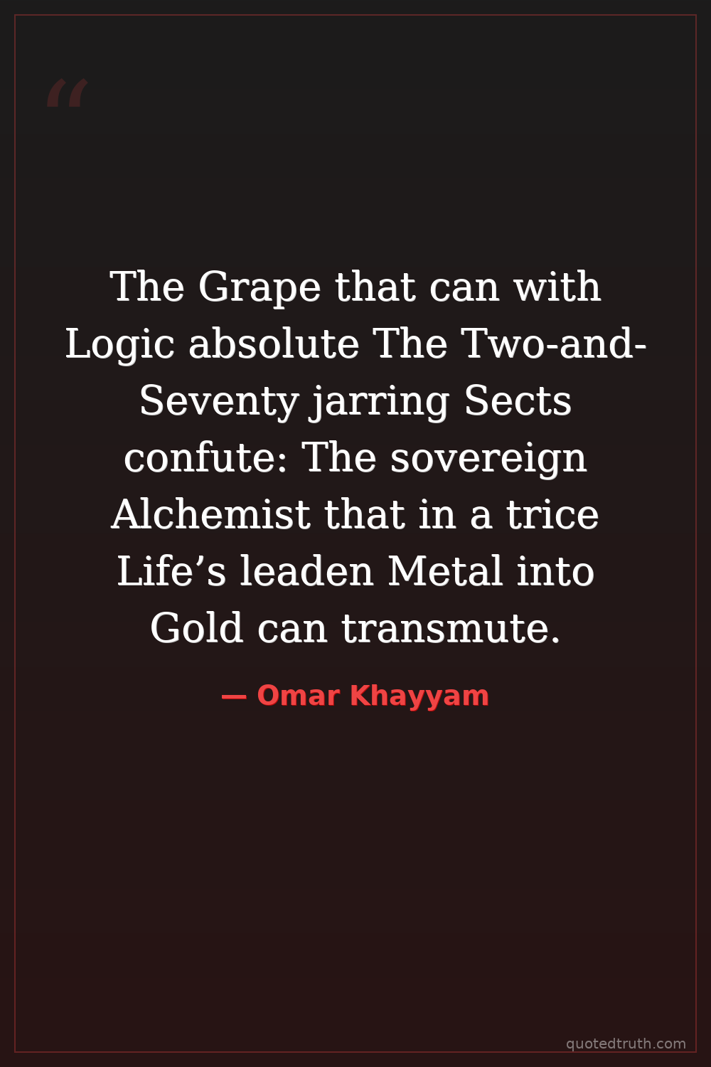 The Grape that can with Logic absolute The Two-and-Seventy jarring Sects confute: The sovereign Alchemist that in a trice Life’s leaden Metal into Gold can transmute.