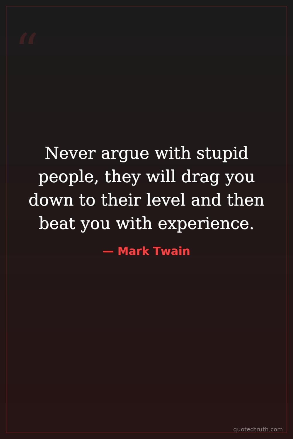 Never argue with stupid people, they will drag you down to their level and then beat you with experience.